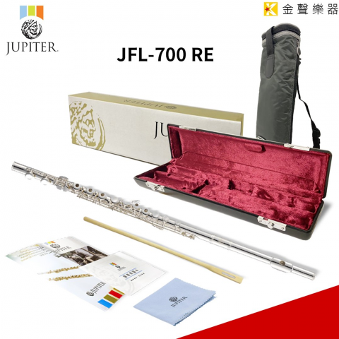 Jupiter JFL700RE 長笛 開孔 E鍵Jupiter JFL700RE是一款能夠幫助學生進步的樂器,開鍵的設計以及鍍銀G鍵方便操作,穩定的音色與品質也能夠長年使用,適合作為學生進階款長笛的選擇之一。1.C調2.鎳銀合金鍍銀/直式吹口管3.鎳銀合金吹口台4.鎳銀合金鍍銀管身5.鎳銀合金鍍銀按鍵6.開孔按鍵系統7.G/A鍵 曲列式8.E鍵裝置配件:通條棒、擦式清潔布、通條清潔布、原廠說明書、產品保證卡、硬盒、外背袋。