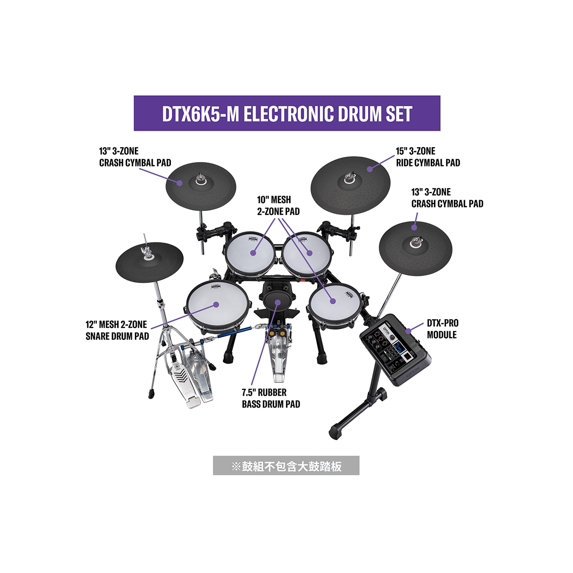 DTX6K5-M 配備大直徑打板與可調式支架,不論是敲擊回饋還是整體演奏姿態,都更貼近傳統鼓組的體驗。從新手到進階玩家,都能找到最舒適的手感與配置方式,享受自然流暢的打擊節奏。