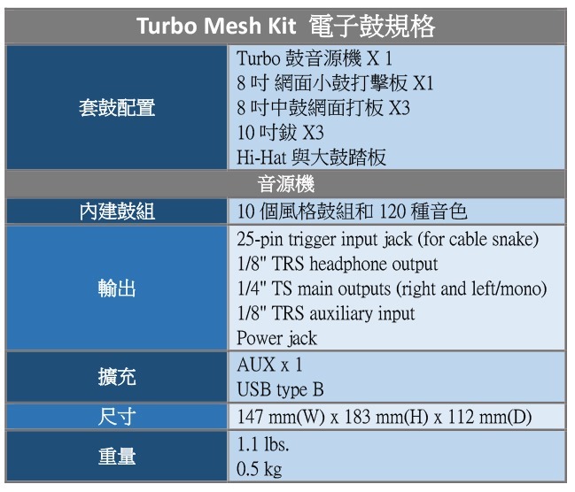 Alesis Turbo Mesh Kit 是一個完整的 7 件式電子鼓套件,以下一代 Alesis 網狀鼓技術為中心。網狀頭是鼓手在演奏電子套件時的壓倒性偏好,因為它們具有自然的感覺和超靜音的響應。Alesis Turbo Mesh Kit 配備一個 8吋網狀小鼓和 三個 8吋 網狀中鼓。包含整個鼓架;三片10吋 銅鈸、特制設計的 Alesis hi-hat踏板和大鼓踏板,以及耐用的鋼架。配件包含有電源線、鼓槌、導線和鼓鍵,便於安裝,因此您可以立即開始演奏!