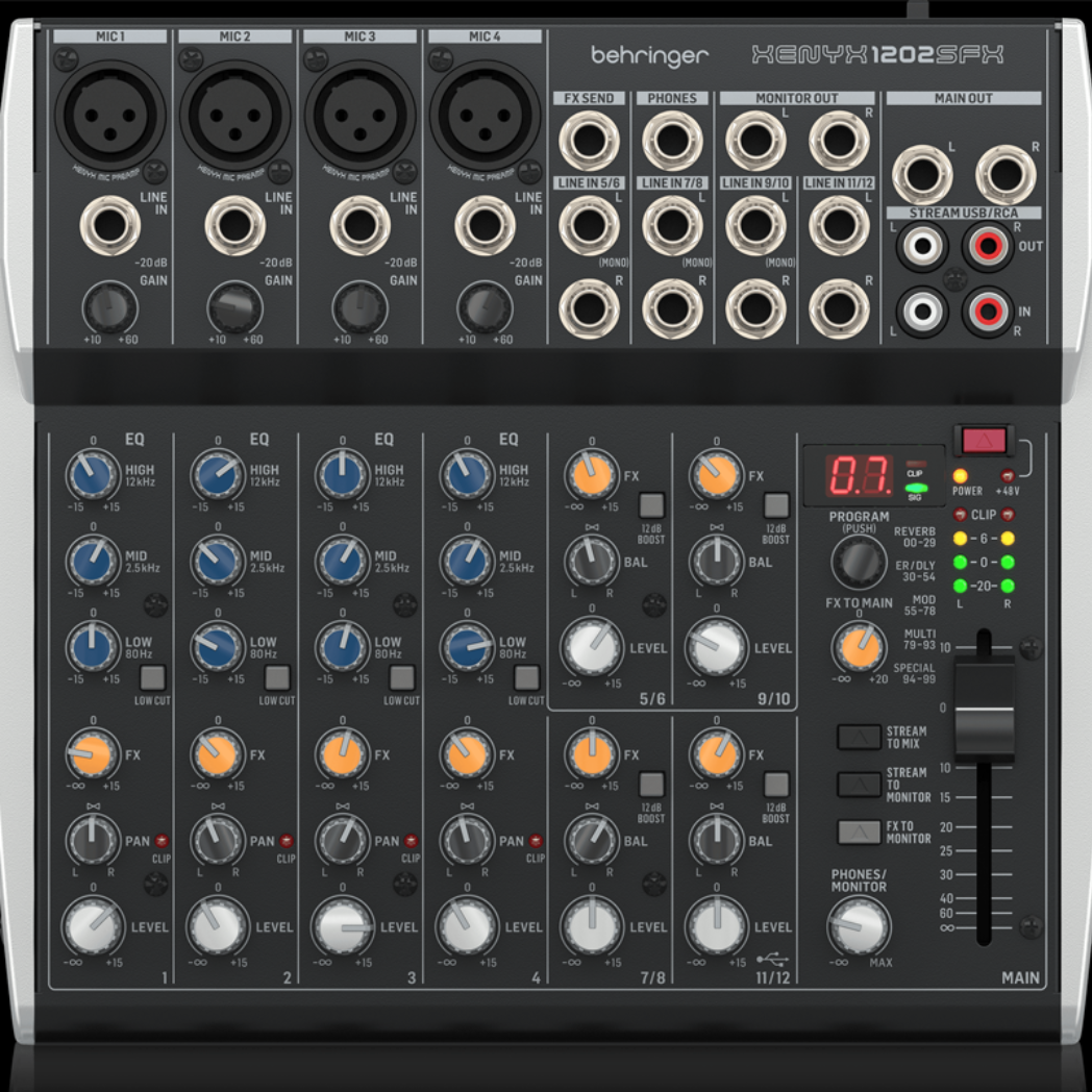 XENYX 1202SFX 模擬調音台具有 12 個輸入,可讓您輕鬆獲得完美適合流媒體、播客或現場應用的優質聲音。由於其屢獲殊榮的 XENYX 麥克風前置放大器具有 48V 幻象電源,甚至可以連接高端錄音室麥克風,因此它提供了溫暖且超音樂的聲音。