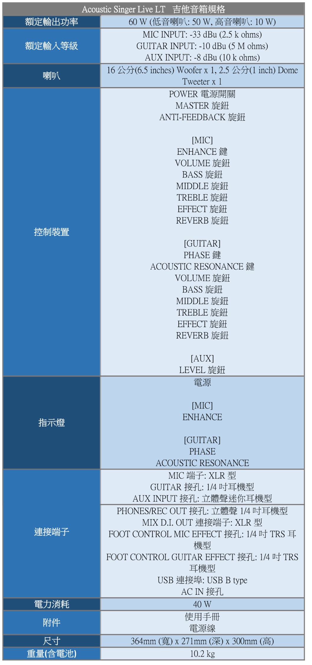 雙擴大器設計,展現優異聲音在高傳真聲音設計當中,雙擴大器是用於精準重現全音域音訊的黃金標準。每款Acoustic Singer型號都採用這種高階規格,加上由獨立功率擴大器驅動的特製低音喇叭和圓頂高音喇叭,得以實現最清晰而自然的聲音。每一次插入樂器時,您將體驗到飽滿、強勁的音色和超乾淨的寬廣頻率響應,而不會發出令人無感的刺耳聲或平淡無奇的聲音。精密的音箱結構進一步增強了精準度和清晰度,消除了不必要的共鳴,並在舞台上提供了最大的投射效果。 彈唱吉他手的All-in-One解決方案Acoustic Singer Live LT的雙頻道,可為木吉他/電吉他和人聲提優異的聲音。分離式類比輸入電路,可捕捉您演奏的全部動態,而獨立的三頻段等化器和效果器,則提供了寬廣的音響控制。在吉他頻道上,BOSS的Acoustic Resonance處理,透過消除一般舞台吉他使用的壓電拾音器的剛硬、無生氣的聲音,來展現自然的音色。而麥克風頻道獨特而強大的Enhance功能,只需一觸,即可在舞台上獲得強大、錄音室般品質的人聲表現。  防回授戰士對於舞台表演者來說,回授音是很常見的問題,特別是由木吉他/電吉他產生的隆隆低頻類型聲音。透過快速操作的控制裝置,Acoustic Singer Live LT為您提供了工具,可快速輕鬆地將它馴服。如果您聽到樂器欲發出越來越大的共鳴,在吉他頻道上的phase開關將為您提供第一線防禦。Anti-Feedback旋鈕則甚至更進一步,讓您搭配notch濾波器來隔離引起問題的頻率並將其完全去除。 連接和控制裝置Acoustic Singer Live LT的背後面板搭載各種您所需的連接介面。配備一個XLR DI輸出可連接家用PA,還有一個aux輔助輸入並具有音量控制裝置,可播放來自智慧型手機或其他設備的音樂。USB接孔提供了電腦連接使用DAW,而Rec/Phones接孔提供標準的1/4吋立體聲連接,可用於靜音練習或錄音到攜帶式設備。您也可以透過選購的開關踏板,來控制吉他和人聲效果器。