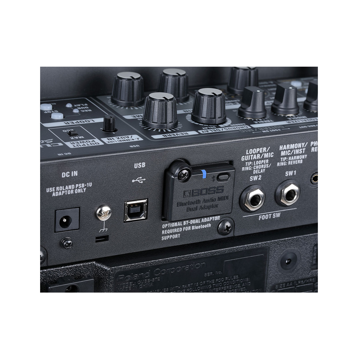 藍牙® 音訊 MIDI 雙功轉接器 (BT-DUAL) 是一款小巧的轉接器,可為相容的 BOSS 產品帶來藍牙音訊 和 MIDI 功能。安裝之後,便可以與您的智慧型手機或平板等藍牙設備配對,並與產品進行無線連線。實際的無線功能,依據所連接產品型號而有所不同,但可能包含了使用藍牙音訊傳輸音樂、使用藍牙 MIDI 來控制產品各種不同的功能等等。