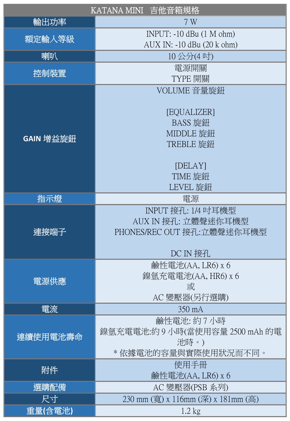 特殊設計,展現高品質音色與一般的小型電池供電吉他音箱平淡無奇音質不同,Katana-Mini可產生強大、飽滿的音色,迷人的聲音讓您一開始演奏就停不下來。BOSS採用特製喇叭、先進的硬體、精細的電路設計,和特別精選的零件,彙整於一身,使它以最小的體積發出最高品質的音色。這款音箱還結合了BOSS數十年對能源效率設計的研究成果,只需6個AA電池,就能獲得強勁有力的聲音。 激發搖滾靈魂的音色Katana-Mini的全類比輸入電路,包括多段增益所驅動的三種經典音色設定,提供與高階音箱設計相同的串聯增益。賦予Katana-Mini令人滿意的音色和快速、互動感,能夠容易地使用輸入音量與彈撥力度來控制distortion。源自BOSS旗艦級音箱Waza amp的設計靈感,Katana-Mini的Brown音色提供了富有表情,豐富泛音的高增益音色,能完美詮釋重搖滾即興演奏以及狂飆的精彩吉他獨奏。Crunch音色提供overdrive,適合演奏搖滾節奏以及藍調主奏旋律,而Clean則提供了清脆、耀眼的音色,充滿強勁的動態反應。 類比Tone Stack與內建延遲效果與其他小型吉他音箱有限的EQ相反,Katana-Mini配備真正三段類比式音色處理。透過調節低頻、中頻、高頻,可獲得自然的聲音,就像堆疊式舞臺喇叭一樣。此外,您可以使用Katana-Mini的tape delay效果營造聲音表現。使用專屬的time及level旋鈕,您可以輕鬆的調節出細微的殘響式空間效果,或長而溫暖的延遲效果。 激發搖滾靈魂的音色Katana-Mini的小巧設計,讓您可以隨時隨地展現吉他音色。它的重量僅1.2公斤,可以輕而易舉放在桌面或櫃架上。配備提手與電池供電功能,您可以輕鬆便利帶著到室內戶外任何地方演奏。Aux In端子可讓您連接智慧手機,跟著您喜愛的音樂或網路影音一起演奏。想要安靜地做個人練習或是錄音時,可以運用Phones/recording輸出端子,連接耳機或錄音設備,同時還具有特殊箱體發聲模擬功能,可以展現逼真麥克風收音的音色。