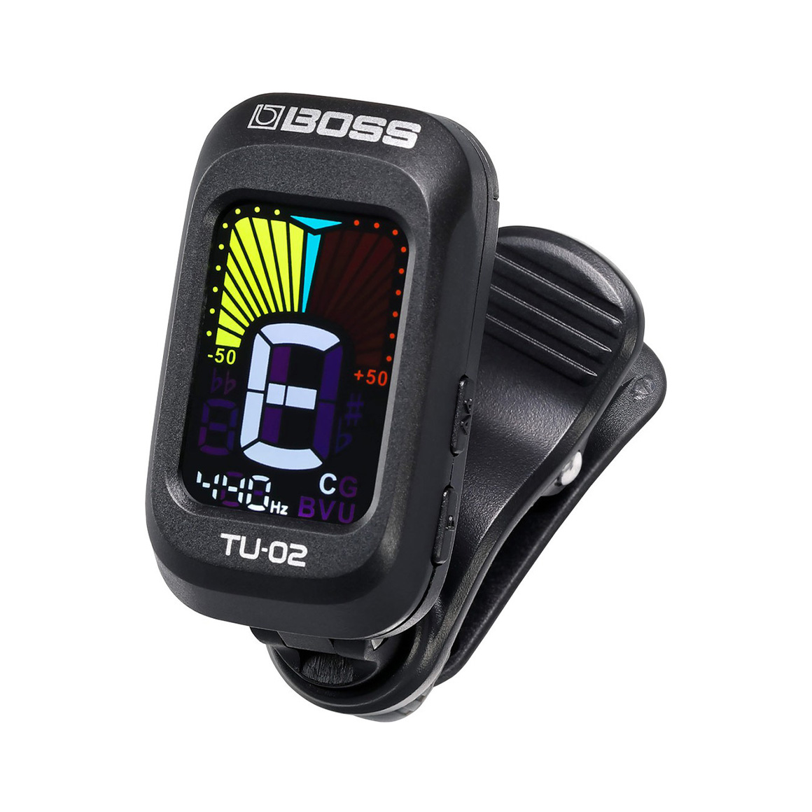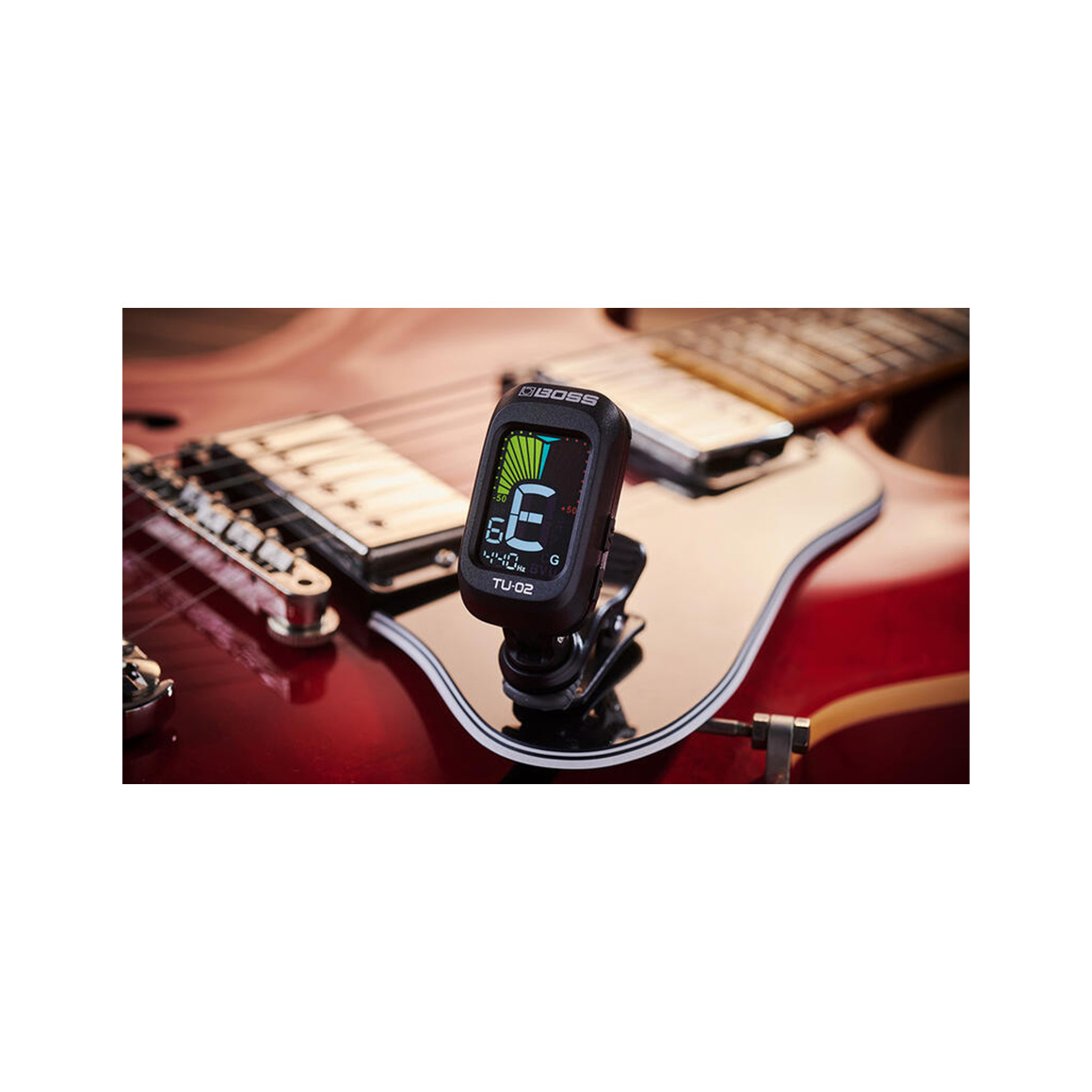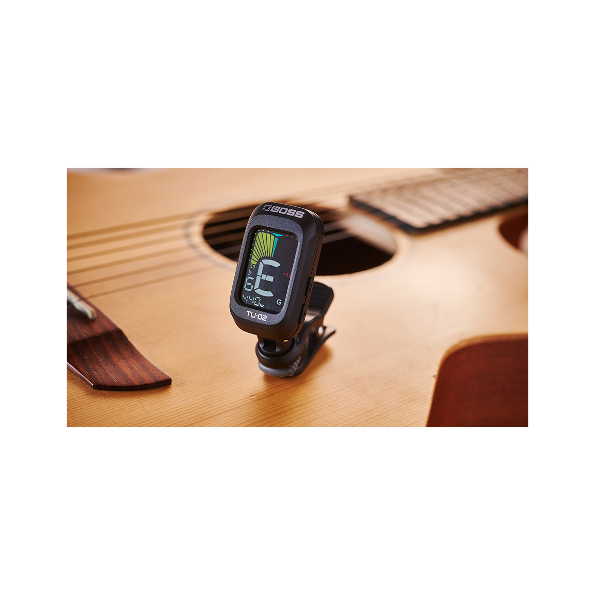 TU-02 具有明亮的彩色顯示螢幕,可旋轉調節,和四種調音模式,可為吉他、貝斯、烏克麗麗、和其他弦樂器提供可靠的調音。