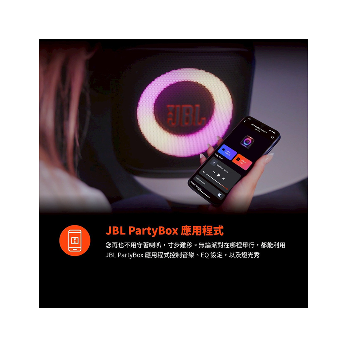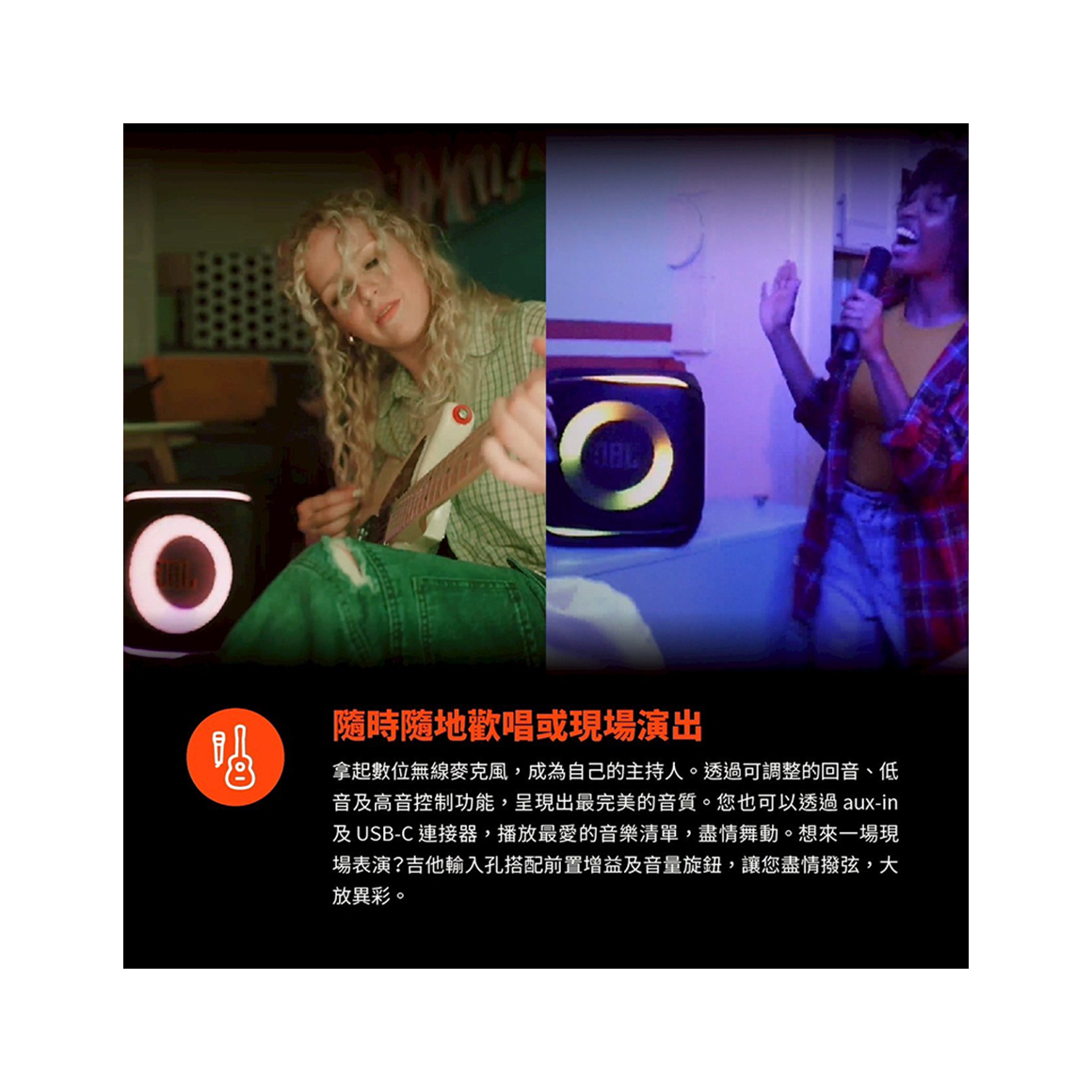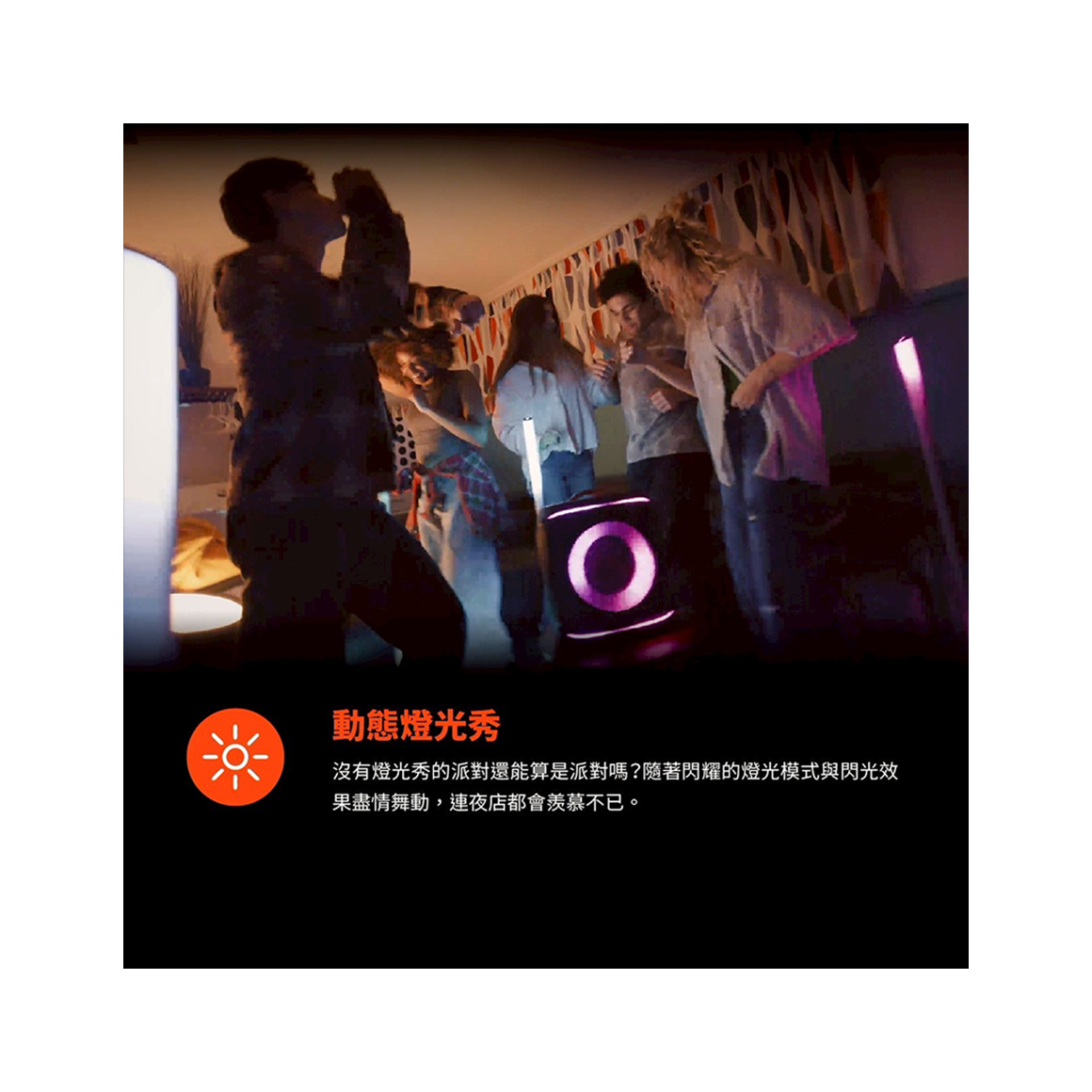 這款可攜式派對喇叭,搭載 JBL Pro Sound 與炫麗燈光秀,讓您隨時隨地成為派對的 DJ、主持人或卡拉 OK 主唱。