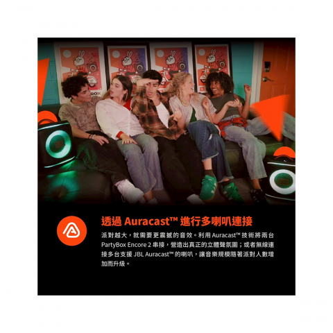 -Auracast™ 多喇叭連接:兩台立體聲,或串聯更多 JBL 喇叭,打造震撼舞池。
