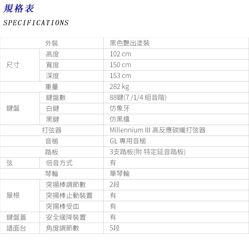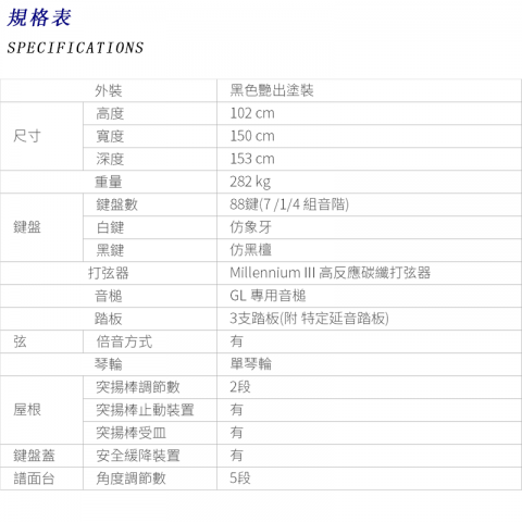 中高音部的琴弦搭載定弦器,獲得更加豐富音質的同時,也使琴弦的位置精密度提升。並使音色、音量更加穩定。譜面台的角度可以做5段調整,在細微的部分也做了奢華的式樣。