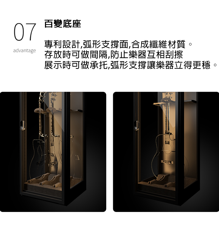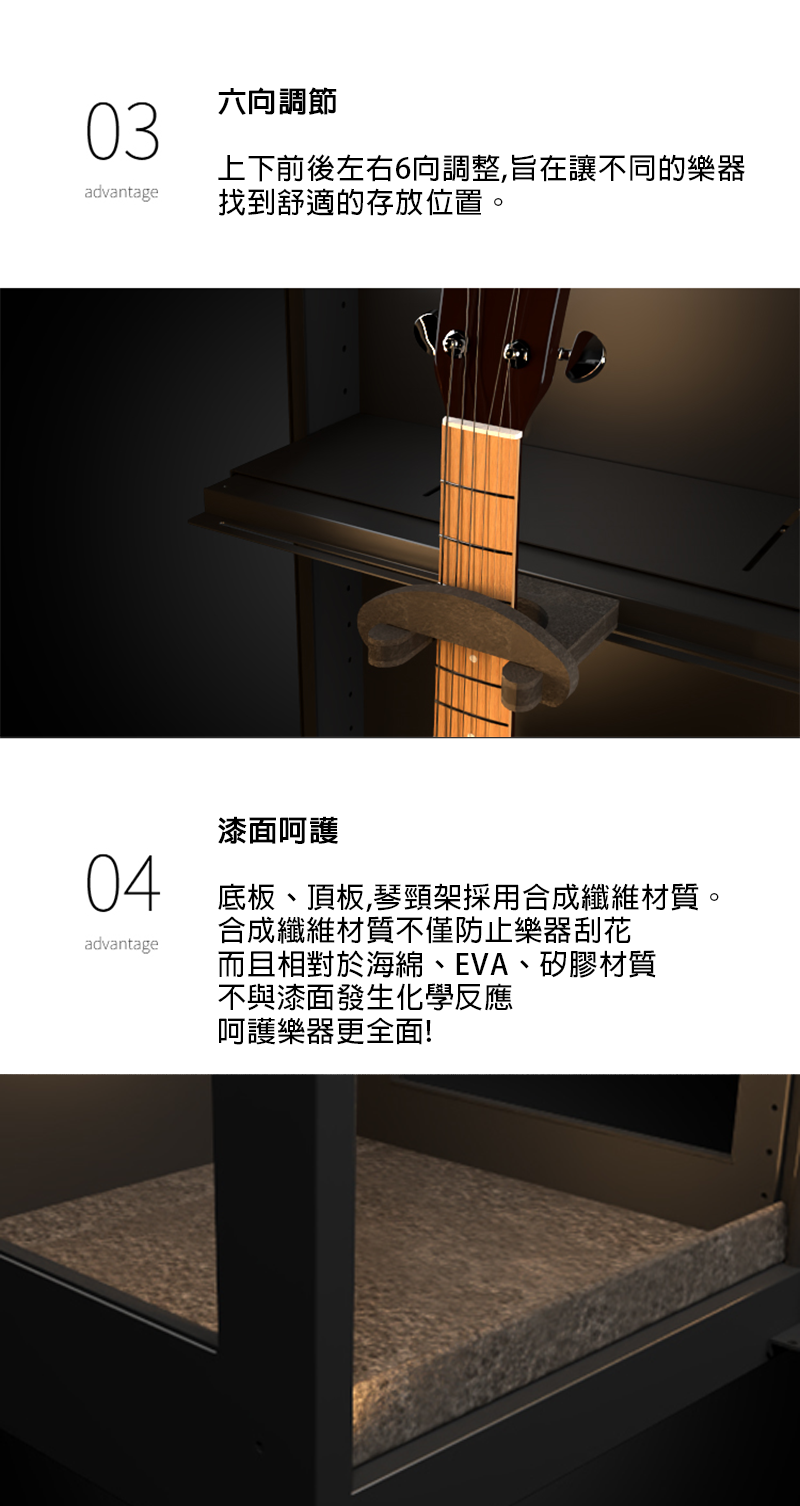 -漆面保護:底板、頂板與琴頸架採合成纖維材質,避免刮傷樂器漆面