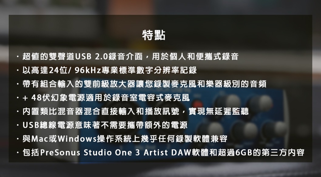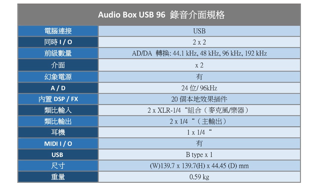 PreSonus AudioBox USB 96 錄音介面是台小巧,方便,超級實惠的雙聲道USB 2.0音頻接口是歌手/歌曲作者和任何想要在家中或旅途中輕鬆錄製的音樂創作人的理想選擇。高品質PreSonus前級放大器,將人聲,吉他和其他樂器收音,全部採用高達24位/ 96kHz的專業數字音頻分辨率。更重要的是,AudioBox USB 96配備了PreSonus的Studio One 3 Artist DAW軟體和超過6GB的額外Plug-in內容,使其成為一個非常有價值的系統。