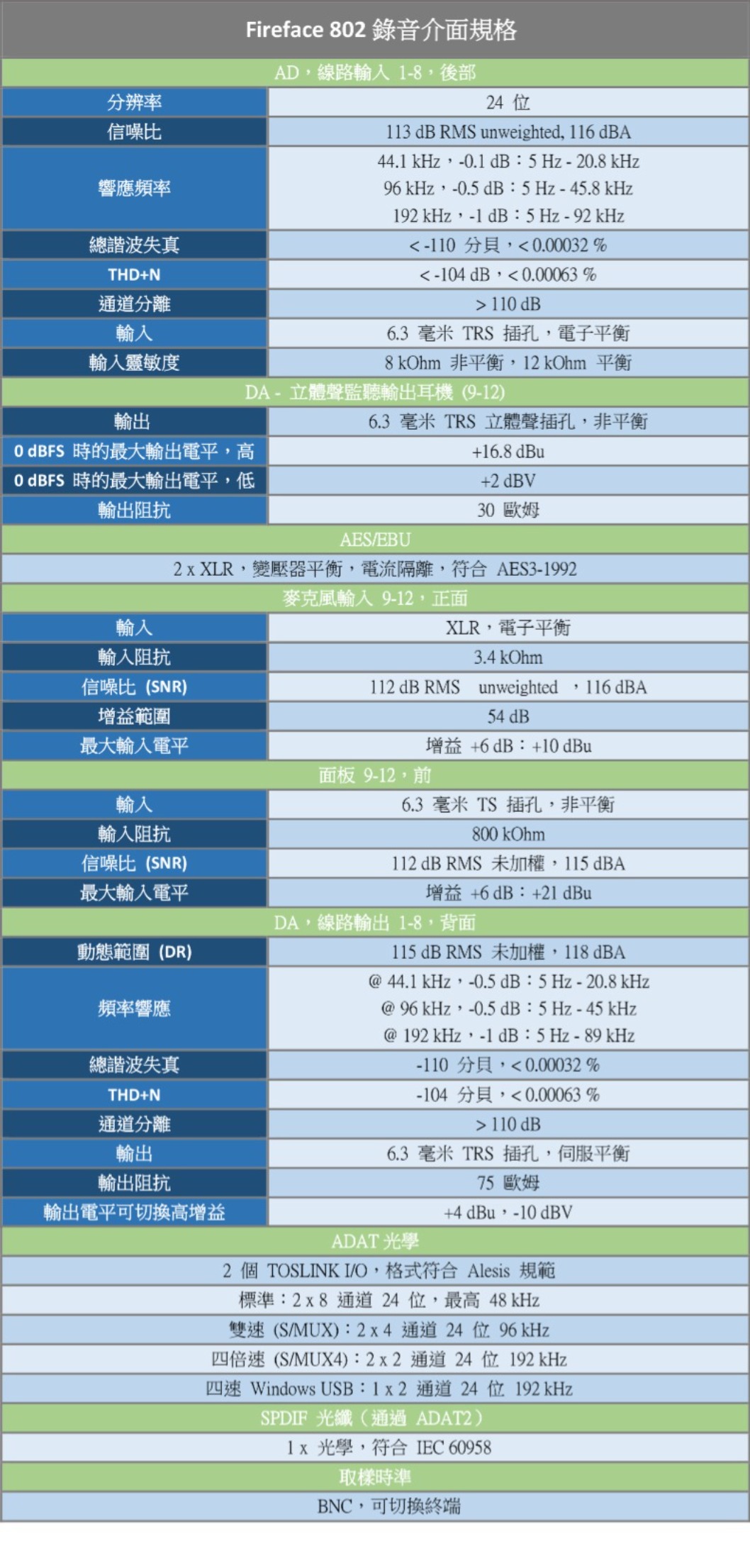 Fireface 802的話筒和樂器前置放大器使用的是OctaMic II的經典技術,是為最高及最刻薄的要求設計的,例如:古典音樂會的專業錄音。傑出的前置放大器設計,超低失真,出色的信噪比和一個完美的線性頻率響應。 無論是高級的舞臺音源,還是典型的演播室信號,無論是低電平、高阻抗樂器,還是動圈、電容和鋁帶式話筒, Fireface 802都是一個高端的音源轉換、放大解決方案,做到真正的不改變音源。