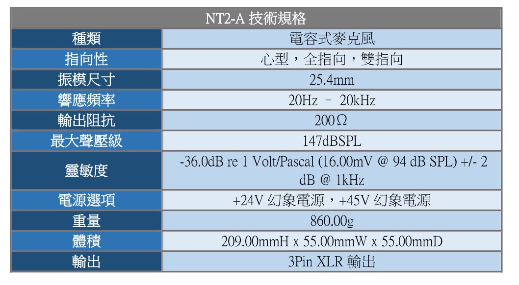 NT2-A將RØDE NT2的傳統再現。這個專業的大震模錄音室麥克風結合了三種調整功能、衰減(Pad)和高通濾波器(High Pass Filter)開關,均裝在麥克風機體上。該傳感器的頻率和瞬態響應完全配合了今天的現代錄音技術,但仍然保留了1950年代和60年代的傳奇麥克風的絲般光滑的音色。這些功能提供了靈活性和最高級的音頻特性,使NT2-A成為目前最通用的電容麥克風之一。附帶SM6防震架、防塵罩、麥克風線和格萊美提名的工程師John Merchant製作的NT2-A各種錄音技術的影片。 RØDE NT2-A電容麥克風在澳大利亞設計和製造,還提供RØDE業界領先的10年保修。