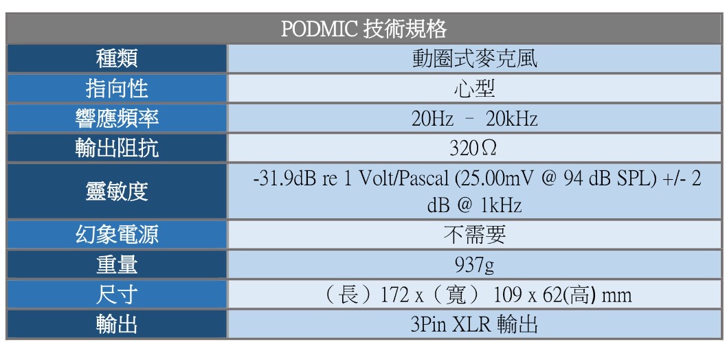 大多數播客多在臥室、家庭工作室或辦公室,因此周遭環境必定會有許多不可抗拒的噪音或干擾。PodMic 具有動態極頭,帶有緊密的心形指向性,同時減少遠離或偏向兩側的不需要的聲音。