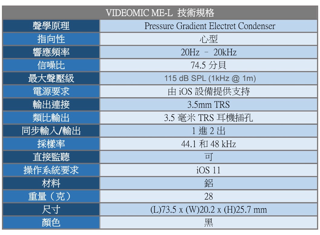 VideoMic Me-L 兼容所有帶有 Lightning 端口並運行 iOS 11 或更高版本的 Apple iOS 設備。