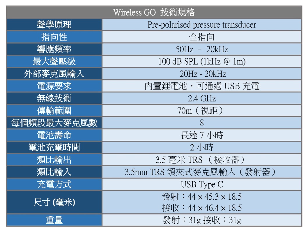 Wireless GO 發射器(TX)和接收器(RX)的重量,分別僅有 31g。在 TX 發射器緊湊的體積內 (44mm x 45.3mm x 18.5mm),可以利用夾式安裝座方便在衣服上使用。另外,還內建了高品質的全指向電阻式麥克風,讓您的無線麥克風不再受「線」。