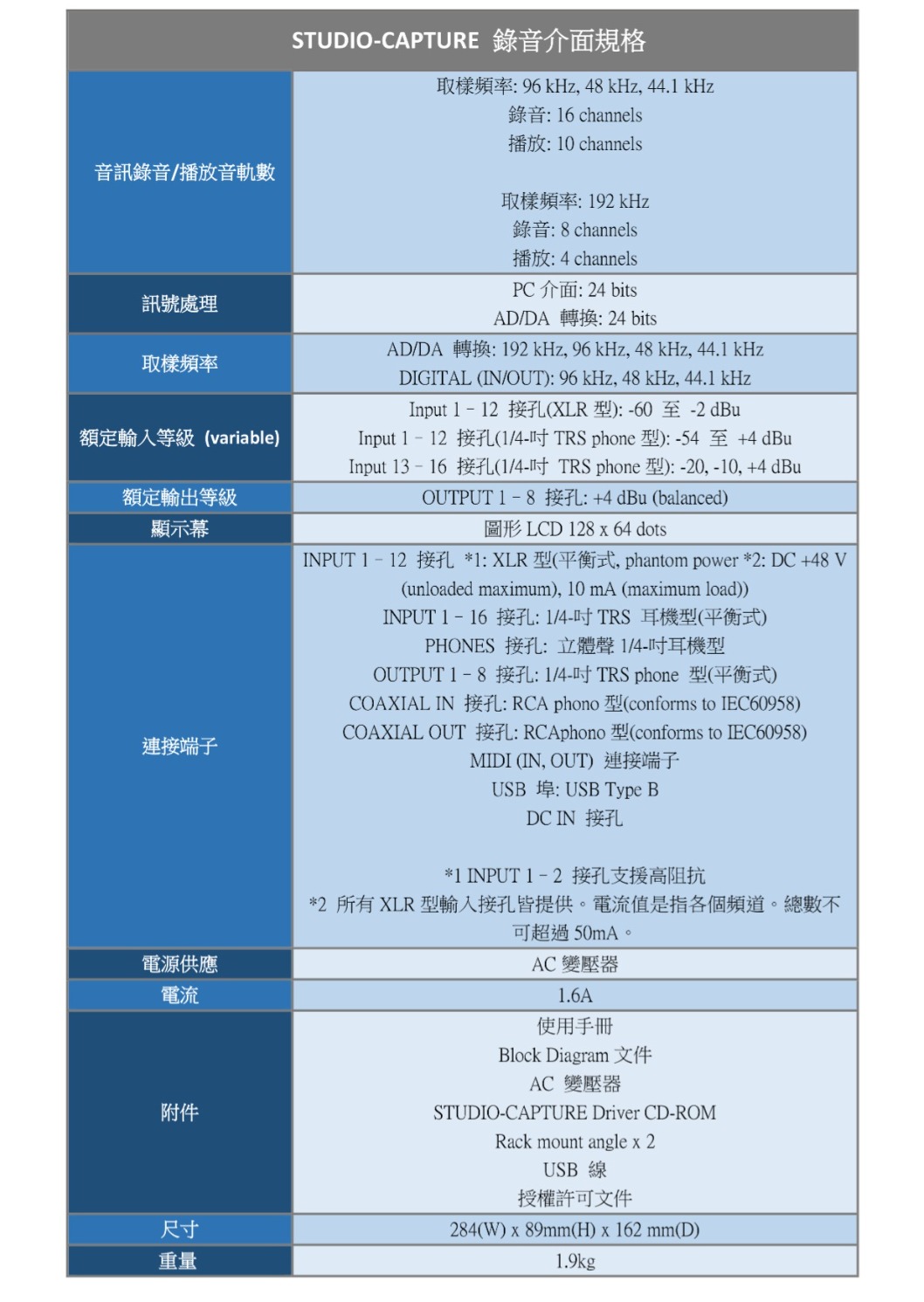 結合專業級的音訊性能、充裕的輸入/輸出端子、以及多功能攜行用設計,STUDIO-CAPTURE是解決當今音樂家、作曲家、錄音工程師的強大功能需求的最佳方案。它能夠達到更高價的專業機櫃型音訊介面的高品質表現,但是體積更小巧,隨身包裹的大小更適用於常旅行的音樂製作人,可以在自家錄音室的桌面使用,或用內附的機櫃掛耳長久裝設在商業錄音室。16個音訊輸入端子﹑12個麥克風前級擴大、以及靈活的監聽混音功能可以讓您無須添購額外的硬體情況下追蹤各個軌道,或是在大型的音樂製作架設環境中同時連接多部合成器與其他設備。因應真正的大型活動需求時,您還可以加上第二部STUDIO-CAPTURE,讓您的I/O擴充到32個輸入端子及24個麥克風前級擴大。