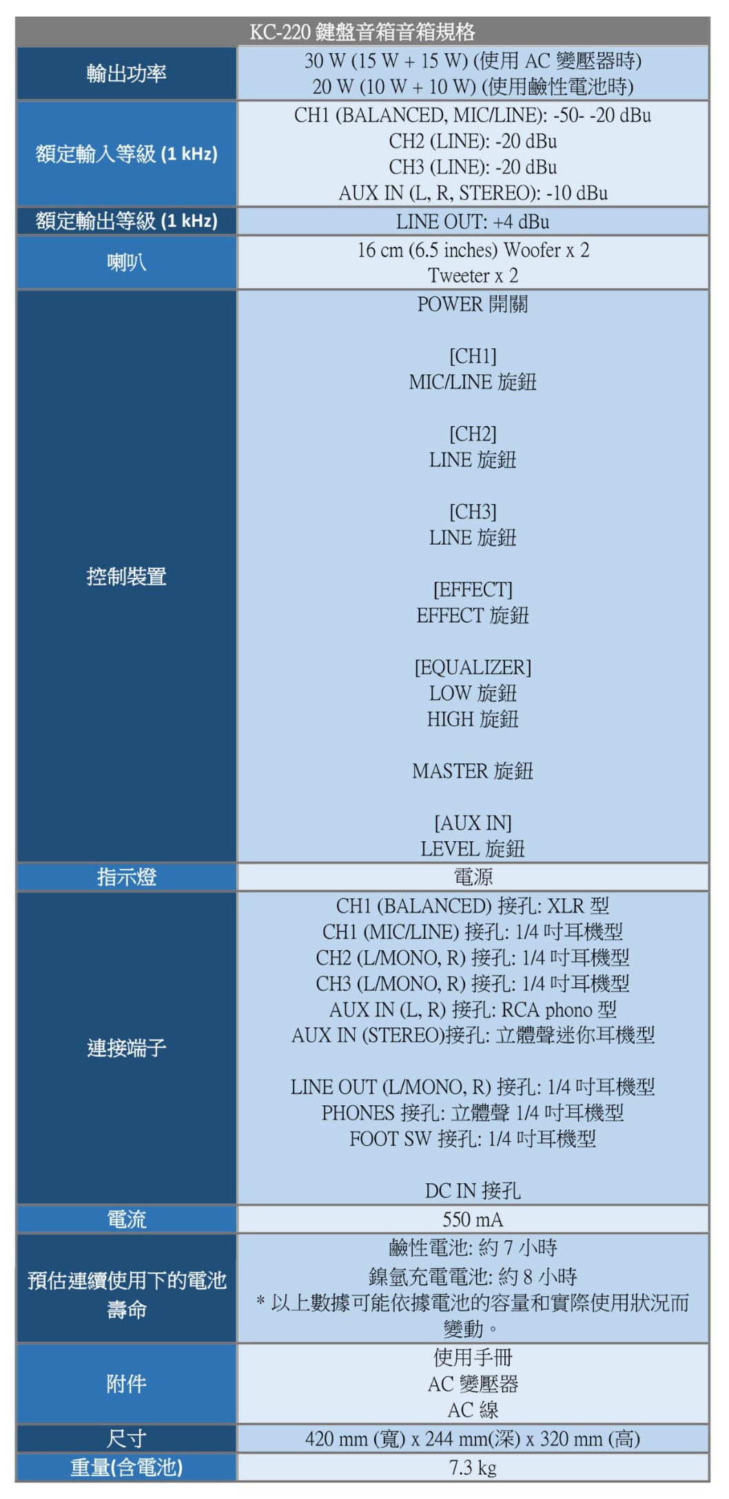 全音域聲音適合表現鍵盤與電子樂器KC-220提供全音域立體聲聲音,具以30瓦功率(15瓦x2),兩個新設計的6.5吋喇叭,兩個特製高音喇叭。搭配為電池操作效能而最佳化的先進電力設計,KC-220可重現88鍵舞臺鋼琴、風琴,和合成器以及節奏樂器和其他電子樂器寬廣的頻率範圍。 內建 3+1 混音功能KC-220外型小巧而輕便,是一款功能完整的立體聲混音系統,攜行方便可跟您到處周遊去巡演。三個1/4吋線性輸入頻道可連接鍵盤、鼓節奏機、還有各種電子樂器,頻道1配備XLR輸入端子,可讓您連接人聲用麥克風。還有專用aux頻道支援1/8吋、RCA連接端子,可連接智慧型手機、音樂播放機等等其他設備。 立體聲效果器和等化器使用KC-220高品質DSP效果器可以輕鬆使聲音更動聽。提供一般和寬廣立體聲chorus效果,還有立體聲殘響適用於人聲與樂器。透過選購開關踏板可以控制效果器開/關,在舞臺上不必騰出手來操作。KC-220也配備高頻和低頻等化器,可依據場地環境調整最適當的整體聲音特質。 配備多種連接端子KC-220配備單聲道/立體聲線性輸出,讓您連接PA系統、舞臺監聽,或是錄音設備。連接至耳機接孔可將內部喇叭靜音,適合私人練習以及在舞臺上用耳機做聲音的檢查。