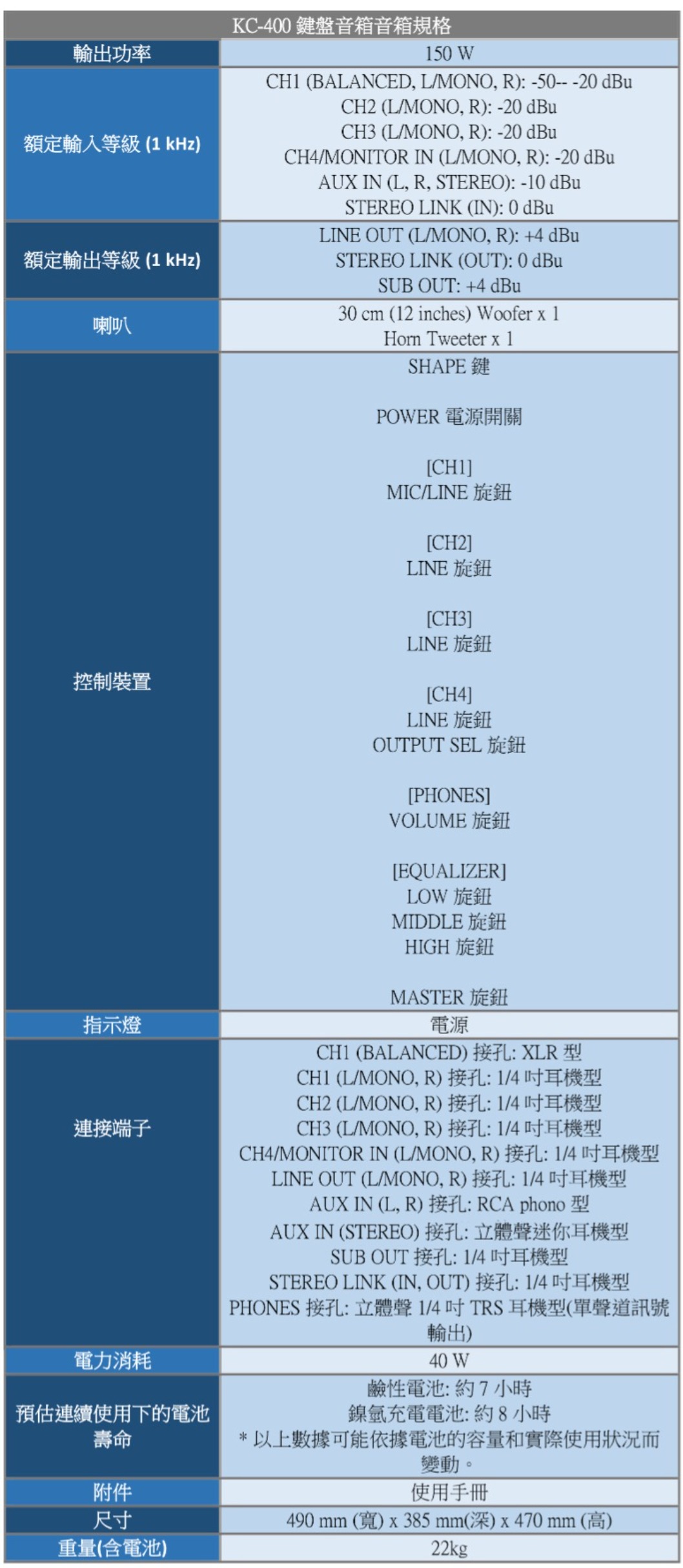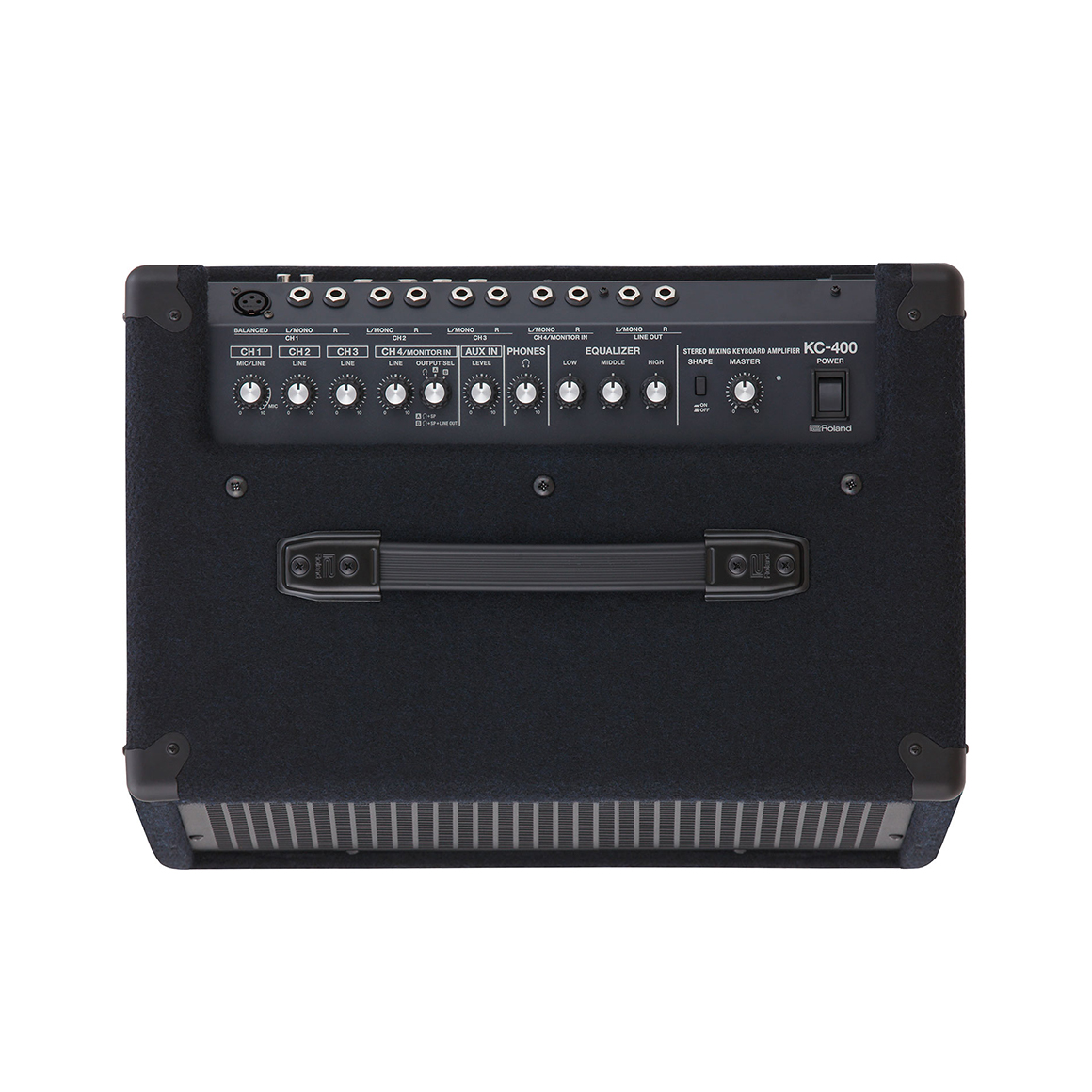 全音域聲音適合表現鍵盤與電子樂器KC-400提供強勁、有力與全音域聲音,具以150瓦功率。音箱體採用Roland專利的雙低音反射式設計,提供無失真的更強低頻響應。搭配全新的電源設計,KC-400在重現88鍵舞臺鋼琴、風琴,合成器以及節奏樂器和其他電子樂器,展現更強的低音表現。高效能的新電源設計也減輕了重量,使KC-400更易於攜行隨您到處巡演。 內建立體聲混音透過KC-400配備的四個線性輸入頻道,您可連接鍵盤、電子打擊板、鼓節奏機等等。還有專屬的輔助輸入端子可連接智慧型手機或音樂播放機,播放背景音樂。線性和輔助輸入支援立體聲連接,讓您發送立體聲聲音到PA或是錄音裝置,當透過Stereo Link連接第二部KC-400也能使用立體聲。頻道1配備XLR輸入端子,可讓您連接人聲用麥克風,展現更多樣化演出。頻道4具有便利的輸出選擇功能,可靈活應用於監聽節拍軌以及導引音軌。 配備多種連接端子提供演出、錄音,與練習用運用簡單易用的連接性能,KC-400可輕鬆融入各種演奏環境中。立體聲線性輸出端子提供1/4吋接孔可連接至PA系統、舞臺監聽音箱、以及錄音設備。還有一個Sub Out端子可連接重低音喇叭,其等級與擴大音箱的總音量連結,可做單鍵控制。KC-400還提供耳機接孔,可完美應用於需要靜音練習和在舞臺個別監聽。 使用立體聲串接功能擴充您的設備如果您需要擴充您的輸入端子或以立體生監聽,KC-400的Stereo Link功能可簡單實現所需。首先,當您在第二部KC-400連接兩個立體聲串聯接孔,可使用的輸入接孔數立刻加倍。此外,所連接樂器的左邊與右邊訊號將會被分散到兩個音箱,為您的舞臺演出設備帶來如錄音室般監聽的聲音體驗。