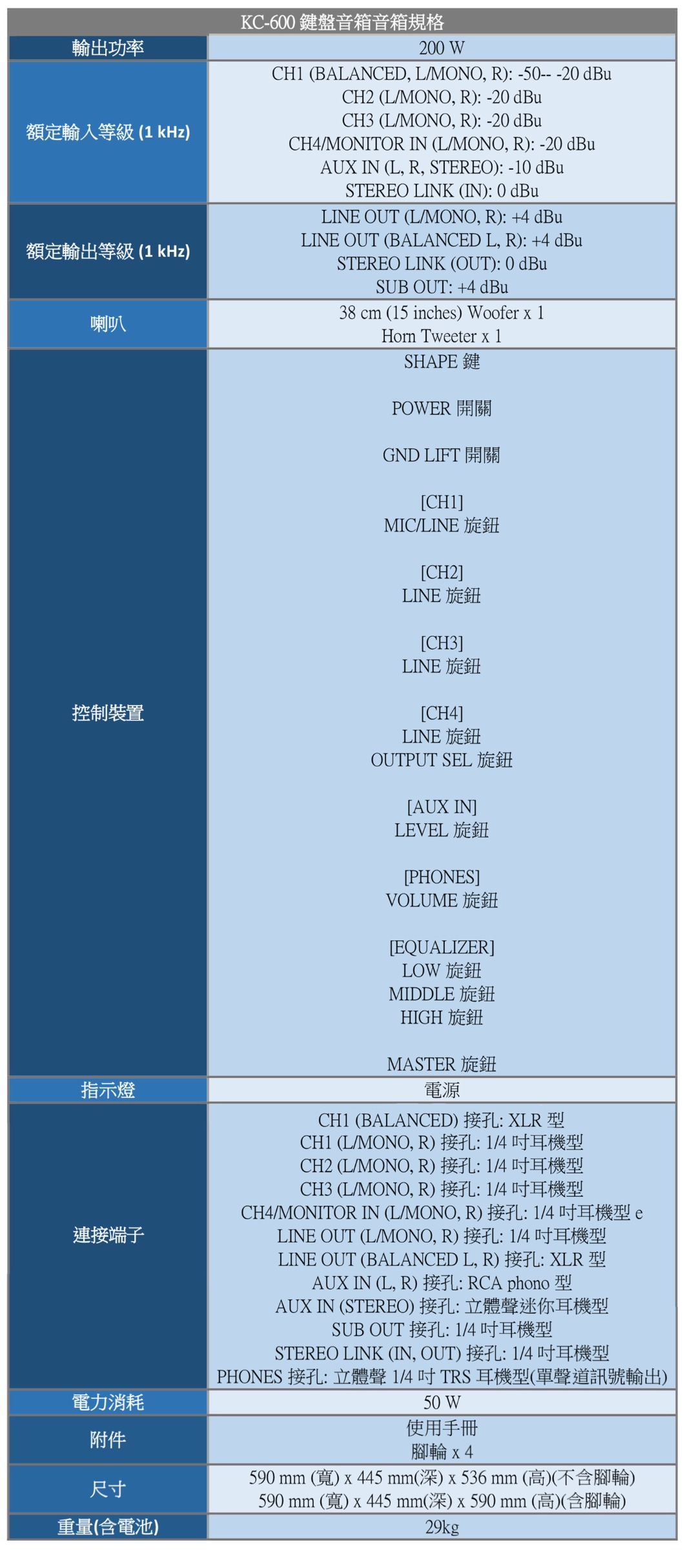 最值得擁有的鍵盤音箱超過二十年來,各界各地的樂手們信賴Roland的KC音箱,它們擁有高逼真度的聲音、內建混音功能、多種連接性能,而且經久耐用。最新一代依然帶著久享盛名的KC一貫的品質,同時提供為當今職業音樂家需求而調節的新增強功能。有KC音箱在您身邊,您將可以全面掌控您的舞臺演出,讓您展現絕佳動人聲音,每次帶來最好的演出狀態。每次演出效果都將讓您深感值得。 KC-600搭載許多新設計的功能,是前一代Roland銷售最佳鍵盤音箱KC-550的升級。功率增加到200瓦,兩音路喇叭系統採用新設計的15吋特製低音喇叭,更提升音質表現。此外,電源系統重新設計提供更好的穩定性,低音表現更加強勁,而且重量更減輕。在KC-600的內建混音器,您將可以連接多種立體聲鍵盤和樂器,加上一個XLR人聲麥克風。還可以透過Stereo Link功能,輕鬆串接第二部KC-600,擴充更多輸入端子以及打造真正舞臺立體聲擴大系統。 特色- 具有200瓦功率的多功能鍵盤擴大音箱