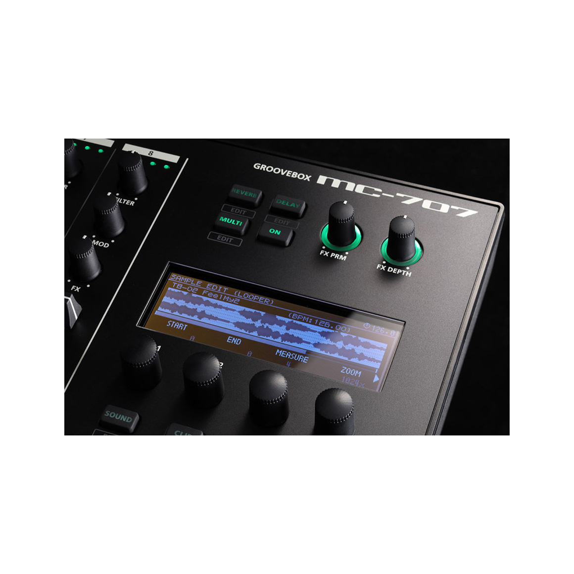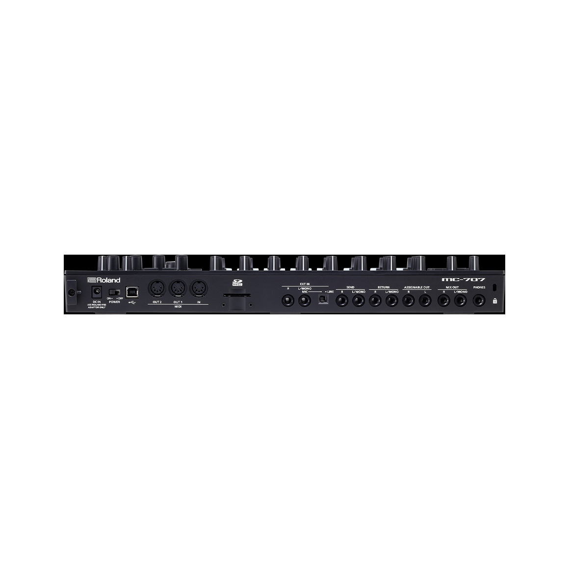 MC - 707 自帶 8 個音軌,包含了多種合成器、效果器、sequencer、取樣,鼓機音源以取樣為主,而合成器引擎以 AX-Edge Keytar 為基底,MC-707 在輸入接孔上有更多選擇。8 個音軌的錄音、sequencing 、取樣、合成器、效果與各種音源庫及 loops ,雙手在操控旋鈕及推桿的同時,Audio 與 MIDI 訊號都能被記錄下來而且完全不用電腦的介入。