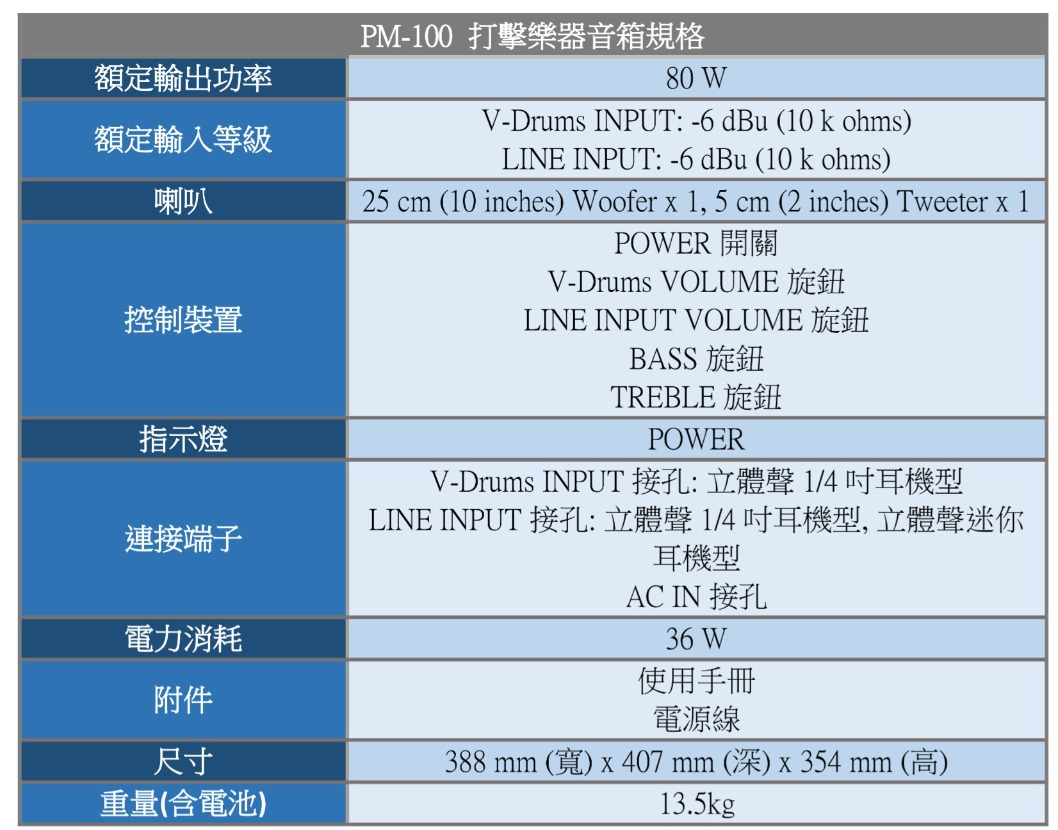 最能表現V-Drums演奏的專業級聲音PM-100是任何V-Drums套鼓的完美伙伴。它小巧的體積適合在家演奏使用,強大的特製喇叭系統,展現豐富飽滿的聲音,具有鼓動人心的撼動力與臨場感。前斜角設計可在您坐在V-Drums時提供最理想的聲音監聽,上方全幅寬的把手為您攜帶音箱以及調整落地位置提供更好的便利性。 多功能的內建混音功能PM-100結合混音器功能,可讓您監聽背景音樂與外接設備和您的套鼓聲音。專屬的V-Drums輸入端子,還有1/4吋與1/8吋的線性輸入端子可連接電子打擊樂器、智慧型手機,和音樂播放機。獨立的音量控制裝置可調整V-Drums與輸入區音量,還有兩頻帶等化器可調節總體聲音特性。