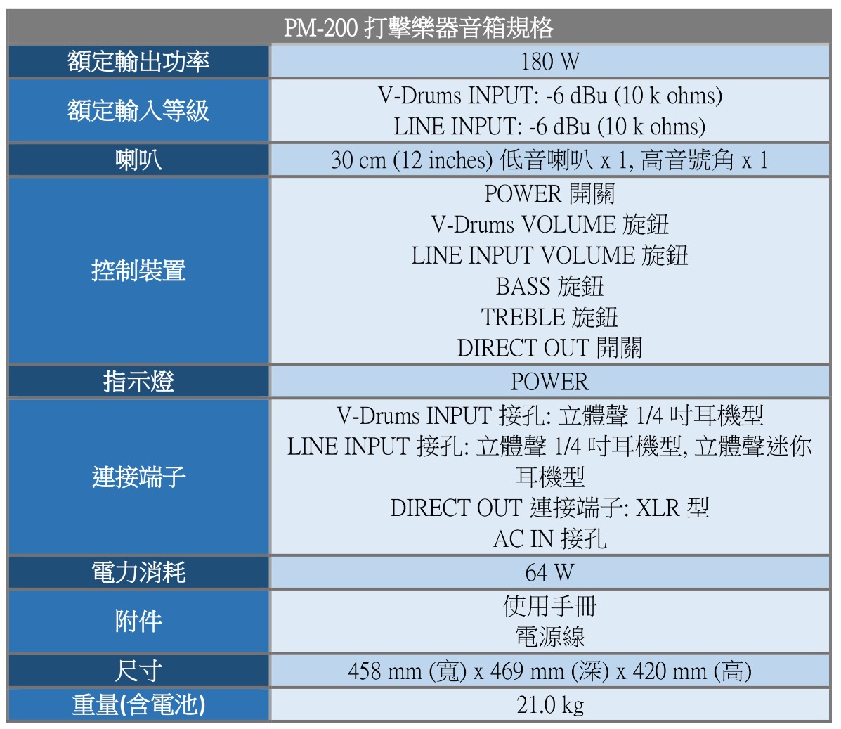 最能展現V-Drums鼓聲的專業級聲音PM-200是任何V-Drums套鼓的完美伙伴。它特製的12吋喇叭與高音喇叭,投射強勁、全音域的聲音,180瓦功率為居家與舞臺使用提供充足的發揮能性能。前斜角設計可在您坐在V-Drums時提供最理想的聲音監聽,上方全幅寬的把手,讓您在攜帶音箱以及調整落地位置提供更好的便利性 多功能的內建混音功能PM-200結合混音器功能,可讓您監聽背景音樂與外接設備和您的套鼓聲音。專屬的V-Drums輸入端子,還有1/4吋與1/8吋的線性輸入端子可連接電子打擊樂器、智慧型手機,和音樂播放機。獨立的音量控制裝置可調整V-Drums與輸入區音量,還有兩頻帶等化器可調節總體聲音特性。 Direct Output端子可用於錄音與舞臺表演PM-200也配備了兩個XLR direct輸出端子,可將聲音傳送到混音器或錄音設備,為舞臺監聽、採排,和錄音室應用增添靈活性。PM-200是單聲道監聽音箱,它的輸入端子也支援立體聲連接,讓您將立體聲聲音傳遞到direct output端子。當以立體聲連接V-Drums音源機與V-Drums輸入時,後方面板便利的開關可讓您依據您的設備需要,以兩個單聲道或是立體聲來輸出聲音。