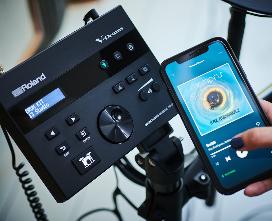TD-07DMK 可讓您輕鬆地與您喜愛的樂團一起打鼓。只需在您的智慧型手機、平板或電腦上選擇音樂,您就能加入無線傳輸到 TD-07 音樂機的音樂行列一起演奏。也可以傳輸影片的聲音,所以您可以跟著線上歌曲和影音課程一起打鼓。如果您沒有藍牙裝置,只需透過音訊導線就能接入立體聲音訊。還支援藍牙 MIDI 傳輸,可用於在音樂應用程式中無線錄製 MIDI 資料。