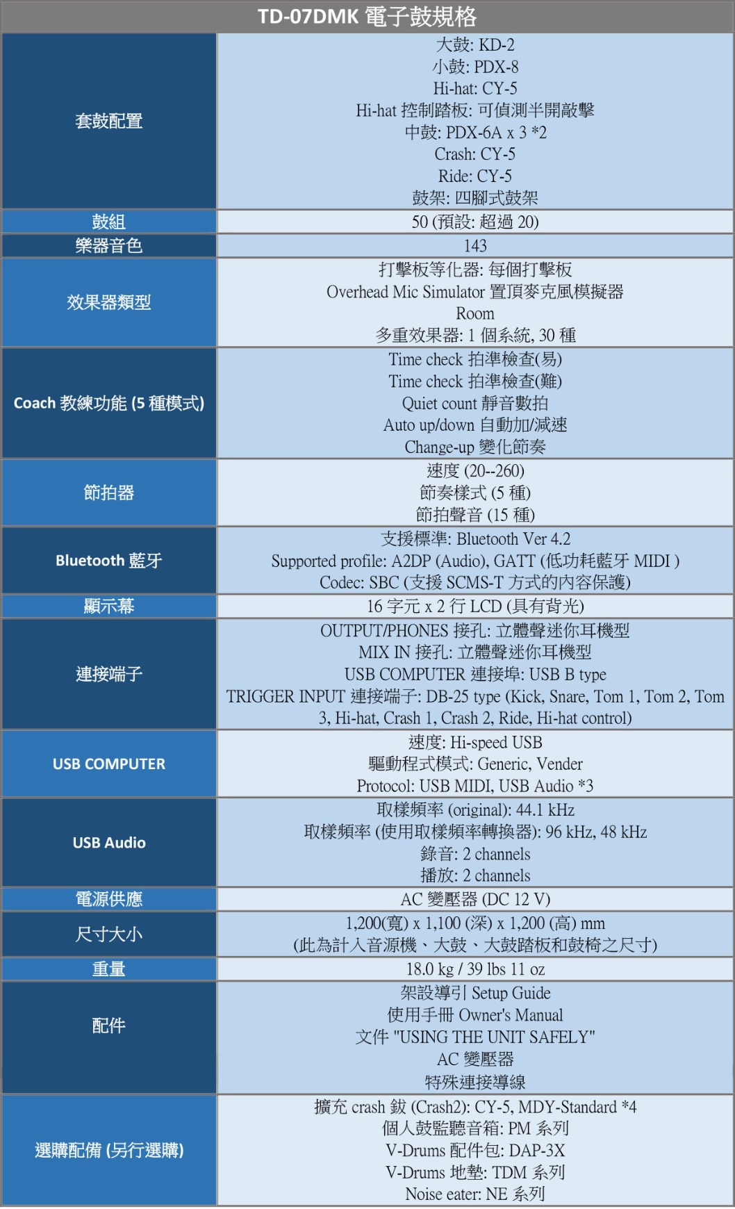 - TD-07 音源搭載 25 個預設鼓組、25 個使用者鼓組和 143 種樂器音色