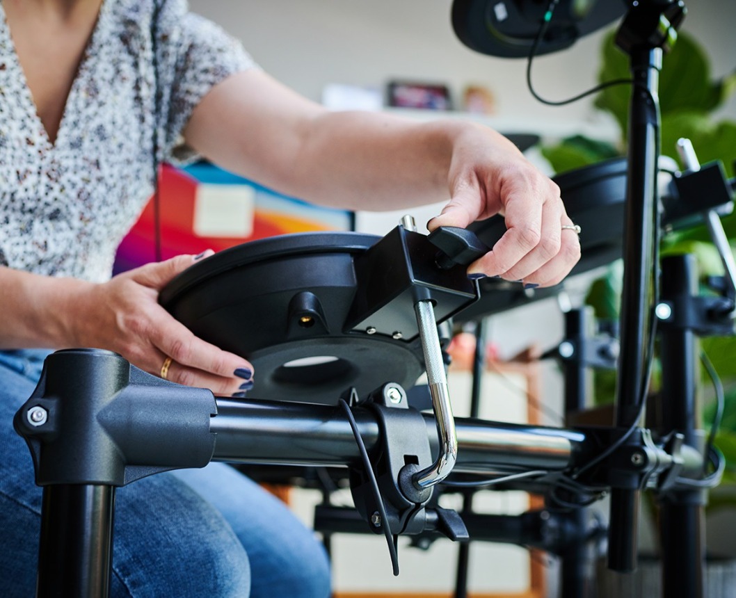 當您熱情打鼓時,要是鼓架搖晃或是打擊板發生移動方向,將讓人瞬間意興闌珊。TD-07DMKN雖為小型鼓組,它強韌的結構提供鼓手最需要的磐石般穩定度,特製鼓架和精密的夾具,可將每個打擊板牢牢定位。秉持 V-Drums 的耐用性聲譽使 TD-07DMK 值得信賴,能夠您承受多年的熱情演奏考驗。