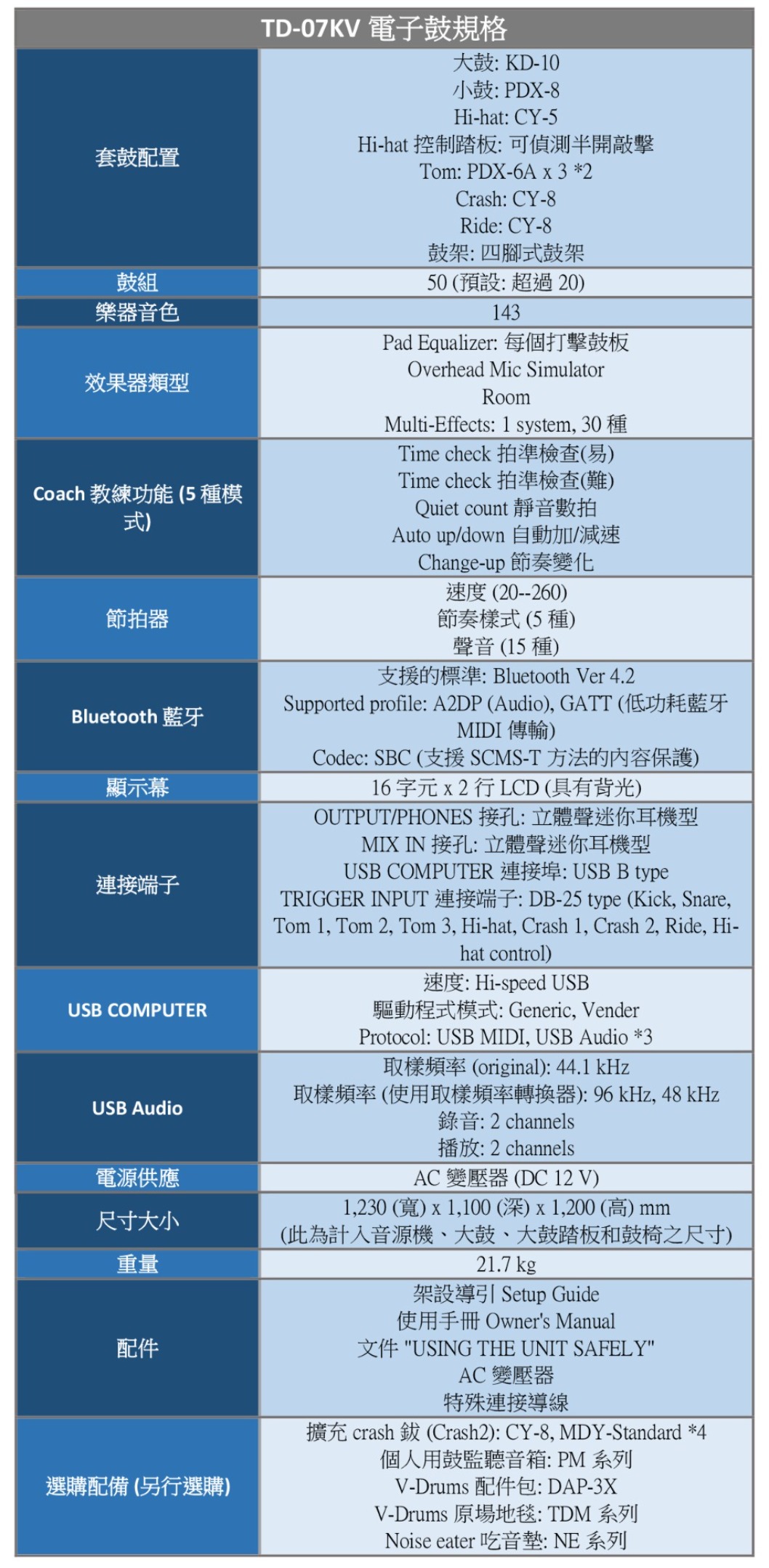 - TD-07 鼓音源機搭載 25 個預設鼓組、 25 個使用者鼓組,和 143 種樂器音色