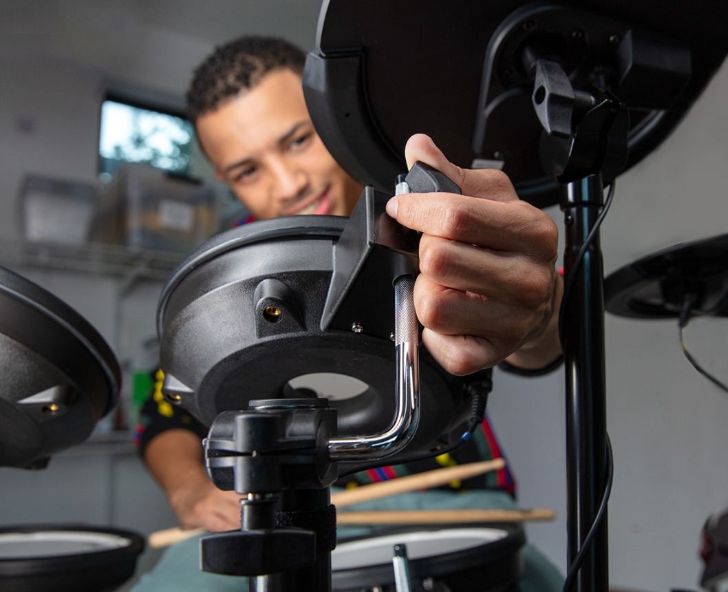 當您盡情地打鼓時,沒有什麼比鼓架不穩或鼓在演奏時開始移動位置更讓人沮喪的了。TD-07KV 的硬體採用堅強的材料和優質的零件打造而成,可提供您所需堅若磐石的穩定性。特製鼓架提供堅固,平穩的支撐,而精密的夾具可將所有套鼓組件緊緊固定在其位置。承襲了 V-Drums 聞名的堅固耐用性,TD-07KV 準備好承受未來多年日復一日的強勁鼓擊。
