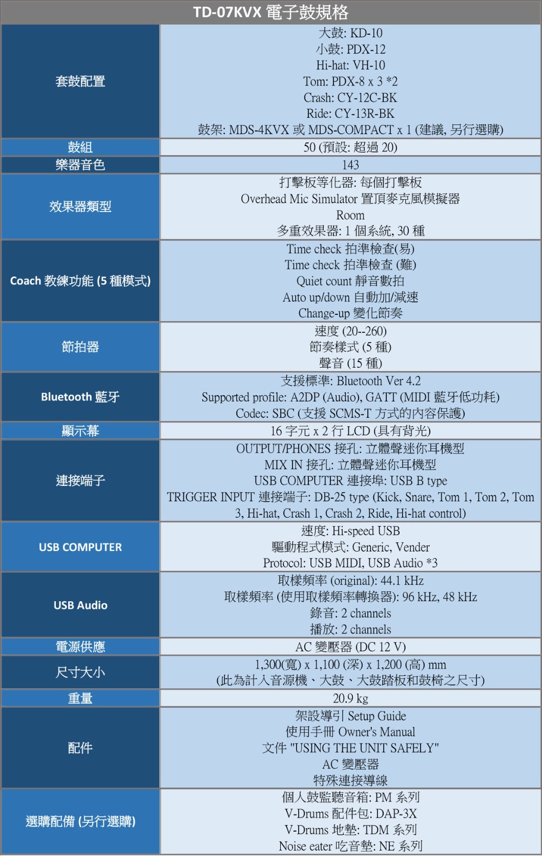- TD-07 音源搭載 25 個預設鼓組、25 個使用者鼓組和 143 種樂器音色