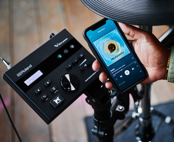 您還可以透過TD-07KVX 和藍牙科技,練鼓時與您最喜愛的音樂對話。在您的手機、平板、或電腦等設備上選擇歌曲,並透過音源機和鼓無線傳輸音訊,立即與您喜愛的歌曲和樂團即興演奏。跟著線上歌曲或課程一起演奏時,您也可以將影片的聲音傳送出來。即使您沒有藍牙裝置,您仍可以透過連接立體聲訊號線來播放音樂。藍牙 MIDI 功能可讓您在音樂 app 裡無線錄製 MIDI 資料。