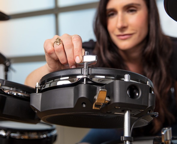 除了預設鼓組以外, TD-50X 可讓您自定您想要的聲音,就像使用傳統鼓組一樣。您可以快速調整調音和消音,或是透過選擇鼓肚深度、鼓面類型,鈸的特性等等,深入調節並重新打造出自訂鼓組。接著,再使用 PureAcoustic Ambience 音場效果將套鼓擺入您選擇的空間中,還可全面控制房間的類型、殘響、立體聲場域寬度和其他參數。