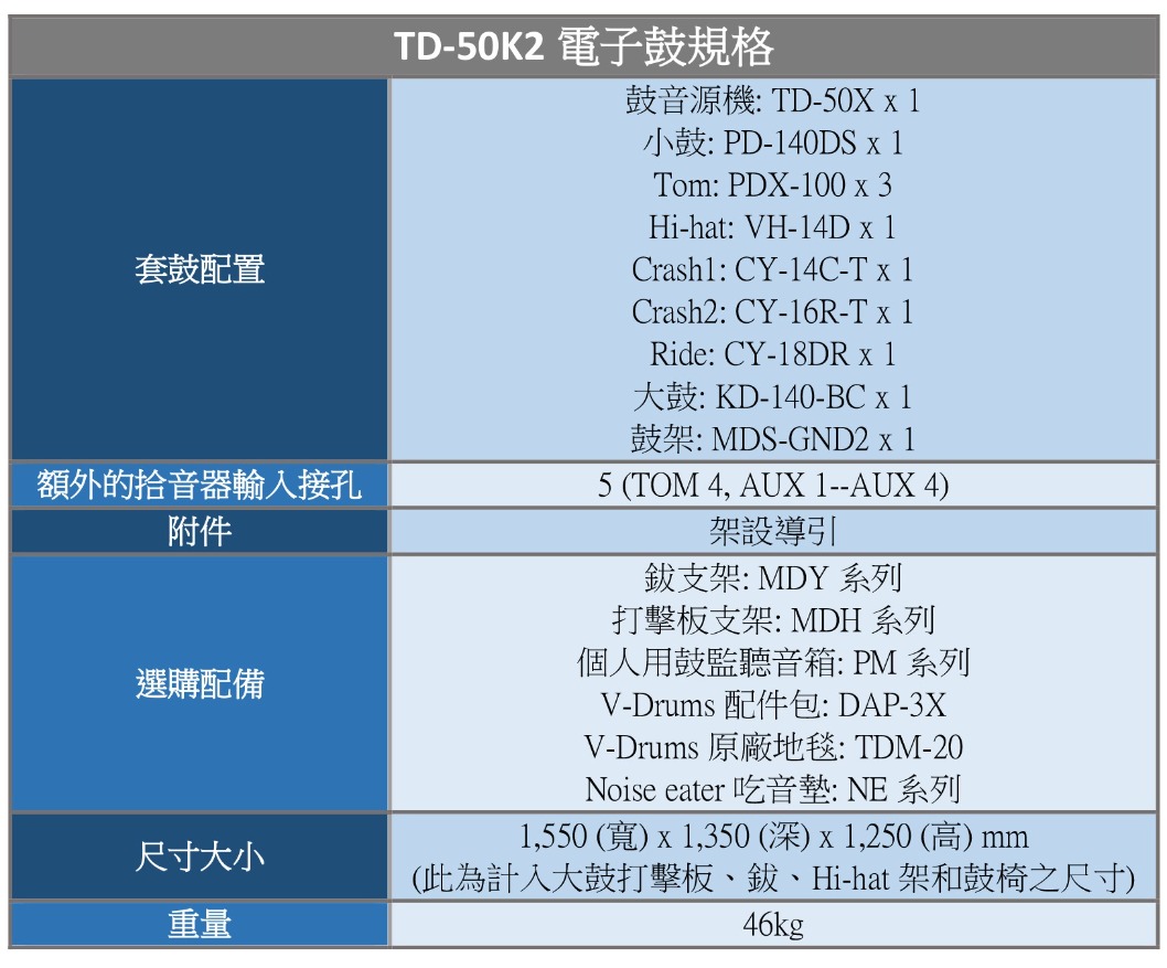 當您想要在小空間中獲得最佳 V-Drums 性能時,TD-50K2 是理想的解決方案。在 TD-50X 鼓音源機和數位小鼓、ride 鈸,和 hi-hat 打擊板效力下,您仍可以獲得在頂規級 TD-50KV2 最重要三個關鍵鼓件。三個10 吋中鼓和 KD-140 大鼓,在縮小尺寸和真實的演奏性之間達到了完美的平衡,而 14 吋和 16 吋的 crash 鈸,提供了大直徑的演奏表面和薄型外形,能夠表現自然的打擊感和晃動動作。MDS-Grand 2 鼓架流線型兼備堅固耐用,還提供充裕的空間,以便為您將來想升級為例如 KD-180 或 KD-220 等全尺寸大鼓時使用。