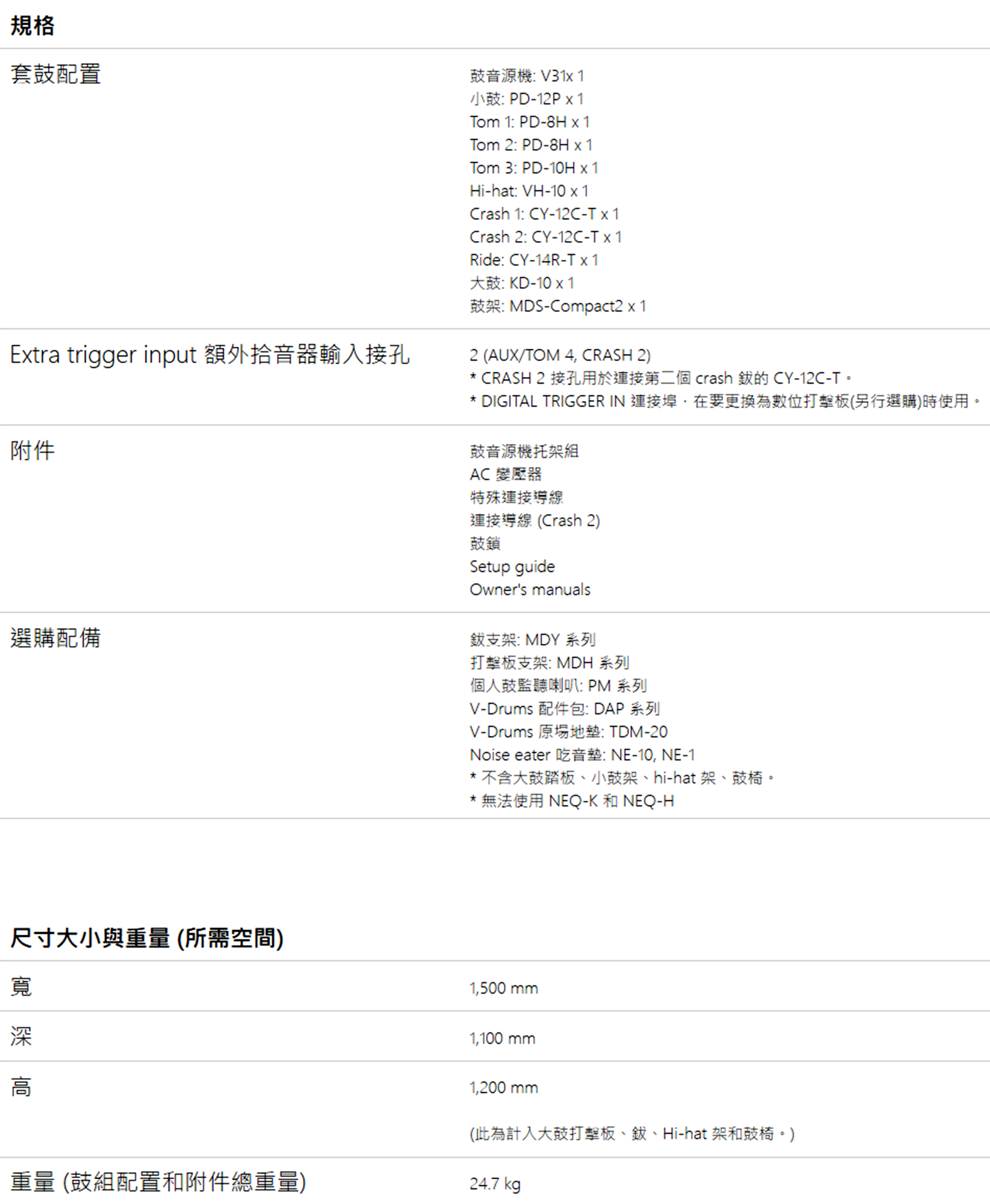 中階 V-Drums 3 Series 套鼓,配備可擴充的 V31 鼓音源機