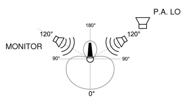 超心形話筒在話筒後部 120° 的點上具有最大的聲音抑制。放置麥克風,使不需要的聲源(例如監視器和揚聲器)處於這些角度,而不是直接在其後面。為了最大限度地減少反饋並確保最佳地拒絕不需要的聲音,請始終在表演前測試麥克風的放置位置。