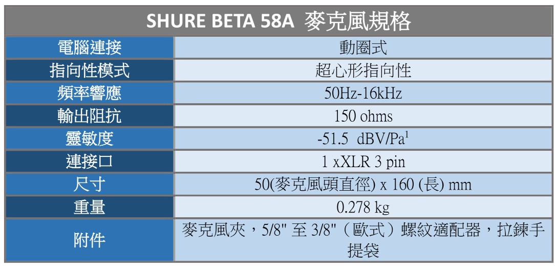 Shure BETA58 ® A 動圈話筒經過精密設計,適用於專業現場擴聲和錄音室錄音應用中的人聲。量身定制的頻率響應突出了人聲的清晰度,緊密的超心形拾音模式確保了反饋前的高增益、最大的聲音隔離和最小的離軸音色。