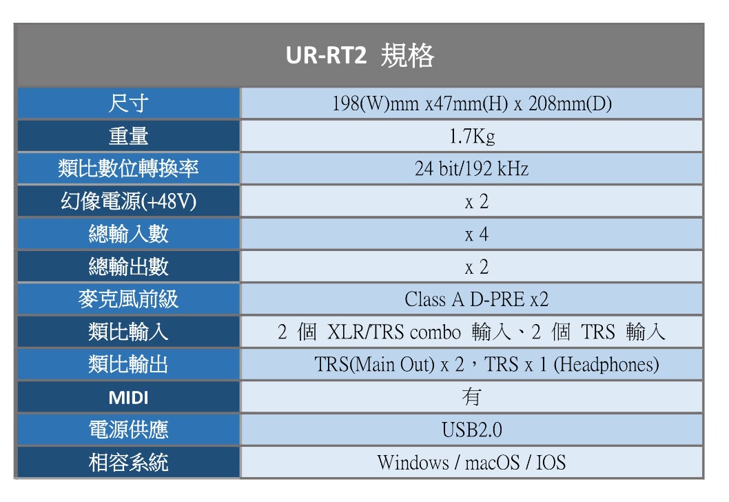 UR-RT-2 是款小而巧又超值的USB錄音介面,兩路輸出 USB 2.0 音頻和 MIDI 接口,無論是在家中還是在旅途中,UR-RT2 都是您的最佳選擇。憑藉高品質 D-PRE 麥克風前置放大器和可切換 Rupert Neve Designs 變壓器的富有表現力的音樂聲音,緊湊的 UR-RT2 可提供最動態的效果,