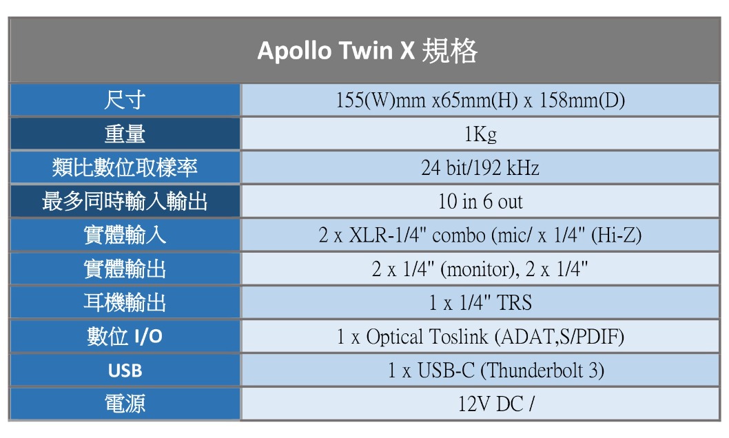 專用 MAC 設計,如果你是 Apollo 的深度使用者,使用 LUNA 將可以為你帶來極高的工作效率與流程。特色:.10 x 6 Thunderbolt 3 錄音介面,可兼容 Mac 及 Windows .沿用 Apollo X 機櫃式錄音介面的 A/D、D/A 傳輸.2 個 Unison 麥克風前級提供 transformer-based 麥克風前級與吉他前級.UAD-2 DUO 或 QUAD 核心可無延遲的運行經典 compressors、EQs、tape machines、mic preamps、以及 guitar amp plug-ins.前方面板配有 Hi-Z 樂器輸入及耳機輸出.內建語音回放(talkback)麥克風,可供錄音工作溝通、cue 點.監聽功能進階,可指定 Mono、Mute、DIM 及 ALT 模式.可經由 ADAT、S/PDIF 擴充最多至 8 軌.包含經典的 UAD plugin: Teletronix LA-2A 及 1176 compressors、 Pultec EQs、 UA 610-B Tube Preamp & EQ 等.大部分的 DAW 都可運行 UAD plugin,含 VST、AAX 64 及 RTAS 格式