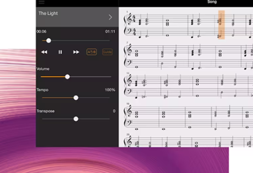如果想要彈一首曲子,可是不知道該從哪開始或是該做什麼,就可以用 Yamaha 專屬應用程式 Smart Pianist 中的自動生成伴奏譜功能。應用程式會分析歌曲的音訊資料,並且建立 50 多種伴奏的和弦,以搭配彈奏。只要跟著瀑布引導燈彈奏即可。