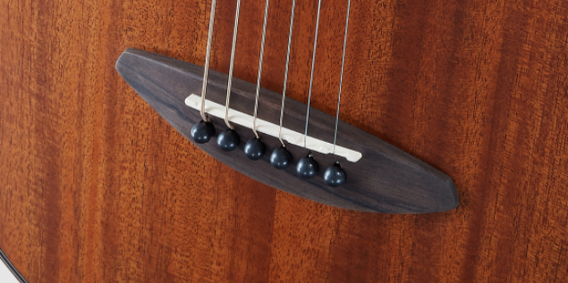 鳥吉他定製的橢圓造型琴橋,使用硬度較高的玫瑰木,能支撐琴的後段琴弦張力。搭配水牛骨弦枕,讓琴的延音有力,且擁有純淨的音色,質地堅硬清脆,能有效的傳導琴弦的共鳴。每一根弦都做了個別補償,讓琴能有更精准的音准。