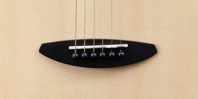 鳥吉他定製的橢圓造型琴橋,使用烏黑色澤的黑檀木,擁有緊密的木紋硬度,硬度更勝玫瑰木,能支撐琴的後段琴弦張力。搭配水牛骨弦枕,讓琴的延音有力,且擁有純淨的音色,質地堅硬清脆,能有效的傳導琴弦的共鳴。每一根弦都做了個別補償,讓琴能有更精准的音准。