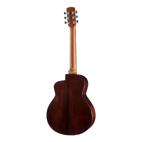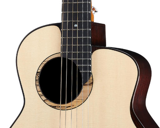 音孔花圈鑲嵌腐朽楓木,增添層次與細節。玫瑰木鑲嵌琴身外側,由側板延伸至面板的玫瑰木曲線護邊,取自「月有陰晴圓缺」概念,美觀及保護功能兼具。細節介紹