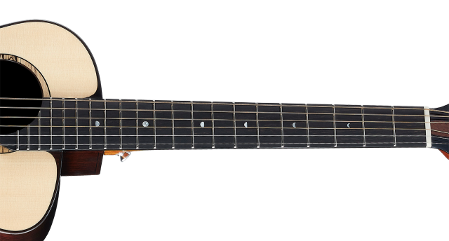 指板使用烏黑色澤的黑檀木,擁有緊密的木紋,硬度更勝玫瑰木。黑檀木的傳導特性,將吉他的高頻更加地顯現出來。琴頸與指板經過拋光、打磨、倒角、去毛刺等多種細節程序處理,講究指板弧度打磨設計,能符合手指弧度,讓持琴手感更加舒適。上弦枕寬度為44mm,指板點鑲嵌白貝殼,並在3, 5, 7, 9, 12, 15格做出月亮陰缺變化,更添質感與細節,擁有21格琴格讓彈奏音域更廣。