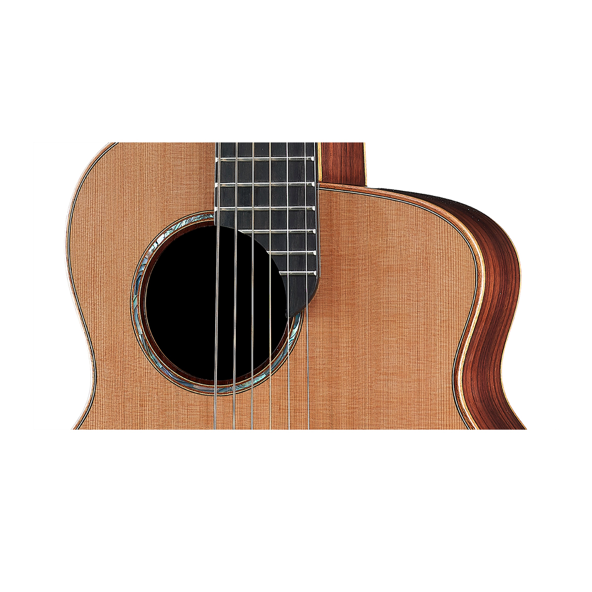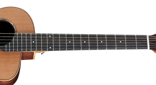 指板使用烏黑色澤的黑檀木,擁有緊密的木紋,硬度更勝玫瑰木。黑檀木的傳導特性,將吉他的高頻更加地顯現出來。琴頸與指板經過拋光、打磨、倒角、去毛刺等多種細節程序處理,講究指板弧度打磨設計,能符合手指弧度,讓持琴手感更加舒適。上弦枕寬度為44mm,,並在3, 5, 7, 9, 12, 15格鑲嵌白貝殼圓點造型設計。擁有21格琴格讓彈奏音域更廣。