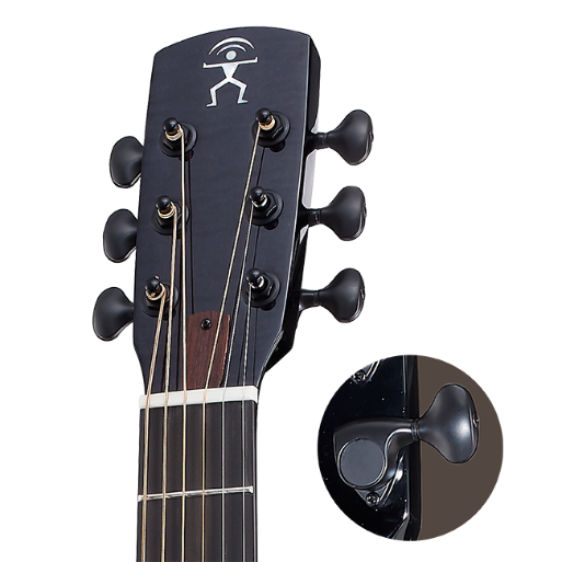 鳥吉他琴頭造型,使用黑影紋楓木作為琴頭貼片,搭配白貝殼鑲嵌aNueNue LOGO,與面板質感相呼應。使用德榮1:18齒輪比的封閉式弦鈕,轉動順暢,能有效的校正音準。