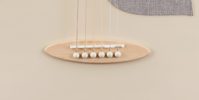 鳥鳥吉他定製的橢圓造型琴橋,使用淺色紋路的楓木,能支撐琴的後段琴弦張力。搭配合成牛骨弦枕,質地堅硬清脆,能有效的傳導琴弦的共鳴。