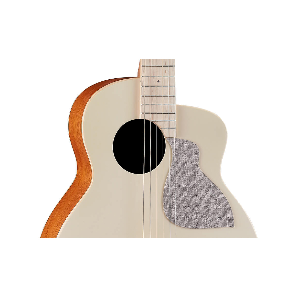 面板搭配 Pantone 杏奶白調和的開放啞光漆,貼近健康的養生印象,親切而安定,在生活中的空間常使用的色彩,給人俐落、平和的感覺,有充滿療癒心靈、簡潔俐落的哲學意義。左上偏移的「補償音孔設計」,增加共鳴震動的空間外,也平衡高、中、低音的清晰度。音孔旁的耐抓布料,挑選家飾布材質,經歷反覆測試,完美黏合耐得住,盡情彈奏也不怕。楓木鑲嵌琴身外側,美觀及保護功能兼具。