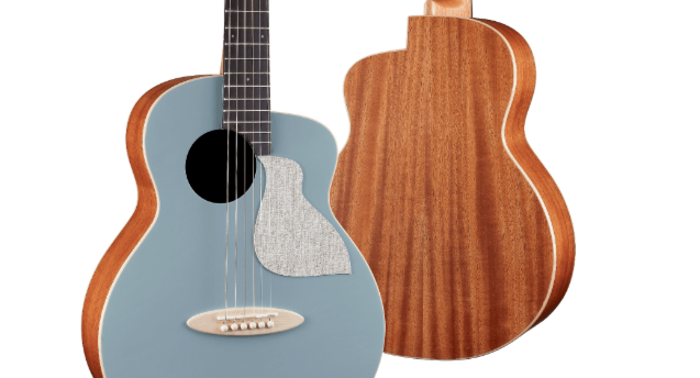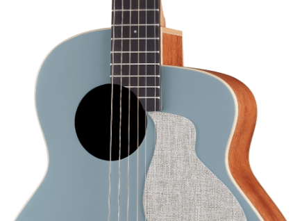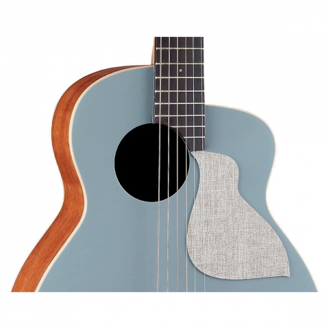 面板搭配 Pantone 阿羅納藍調和的開放啞光漆,取自在馬焦雷湖 (Lago Maggiore) 南邊的古城鎮的阿羅納(Arona),因天候與自然河岸景觀形成的印象顏色,平靜而穩定,如今為家居服飾中最常見的色彩,有充滿心神寧靜、韜光養晦的心靈意義。左上偏移的「補償音孔設計」,增加共鳴震動的空間外,也平衡高、中、低音的清晰度。音孔旁的耐抓布料,挑選家飾布材質,經歷反覆測試,完美黏合耐得住,盡情彈奏也不怕。楓木鑲嵌琴身外側,美觀及保護功能兼具。