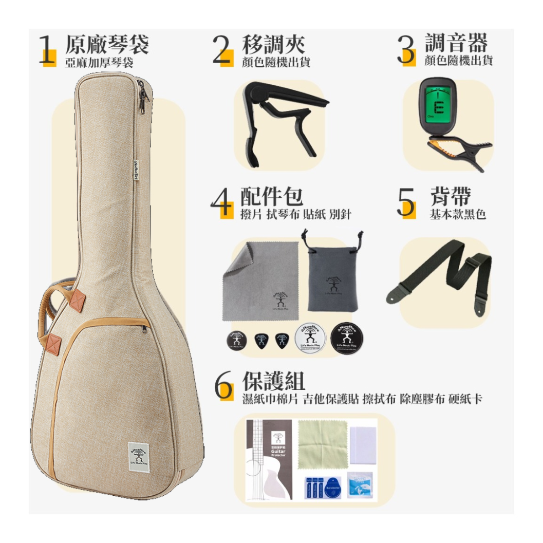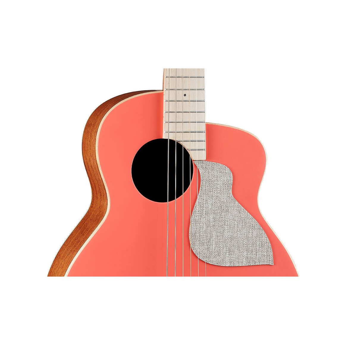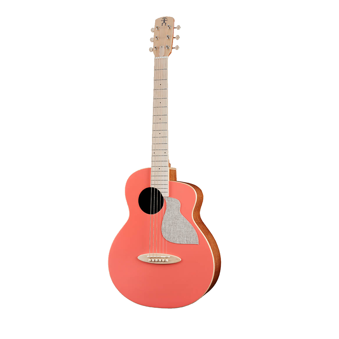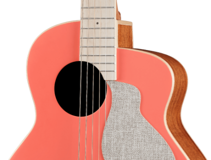 面板搭配 Pantone 活珊瑚橘調和的開放啞光漆,作為2019年代表色,隱身在海底堅韌生機蓬勃的顏色,活潑而柔美,充滿活力、肯定生命的價值意義。左上偏移的「補償音孔設計」,增加共鳴震動的空間外,也平衡高、中、低音的清晰度。音孔旁的耐抓布料,挑選家飾布材質,經歷反覆測試,完美黏合耐得住,盡情彈奏也不怕。楓木鑲嵌琴身外側,美觀及保護功能兼具。